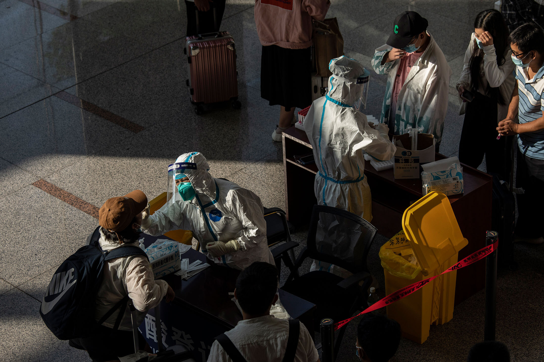 在云南省的主要交通枢纽长水国际机场对旅客进行拭子检测。摄影师:神奇来沈/Bloomberg