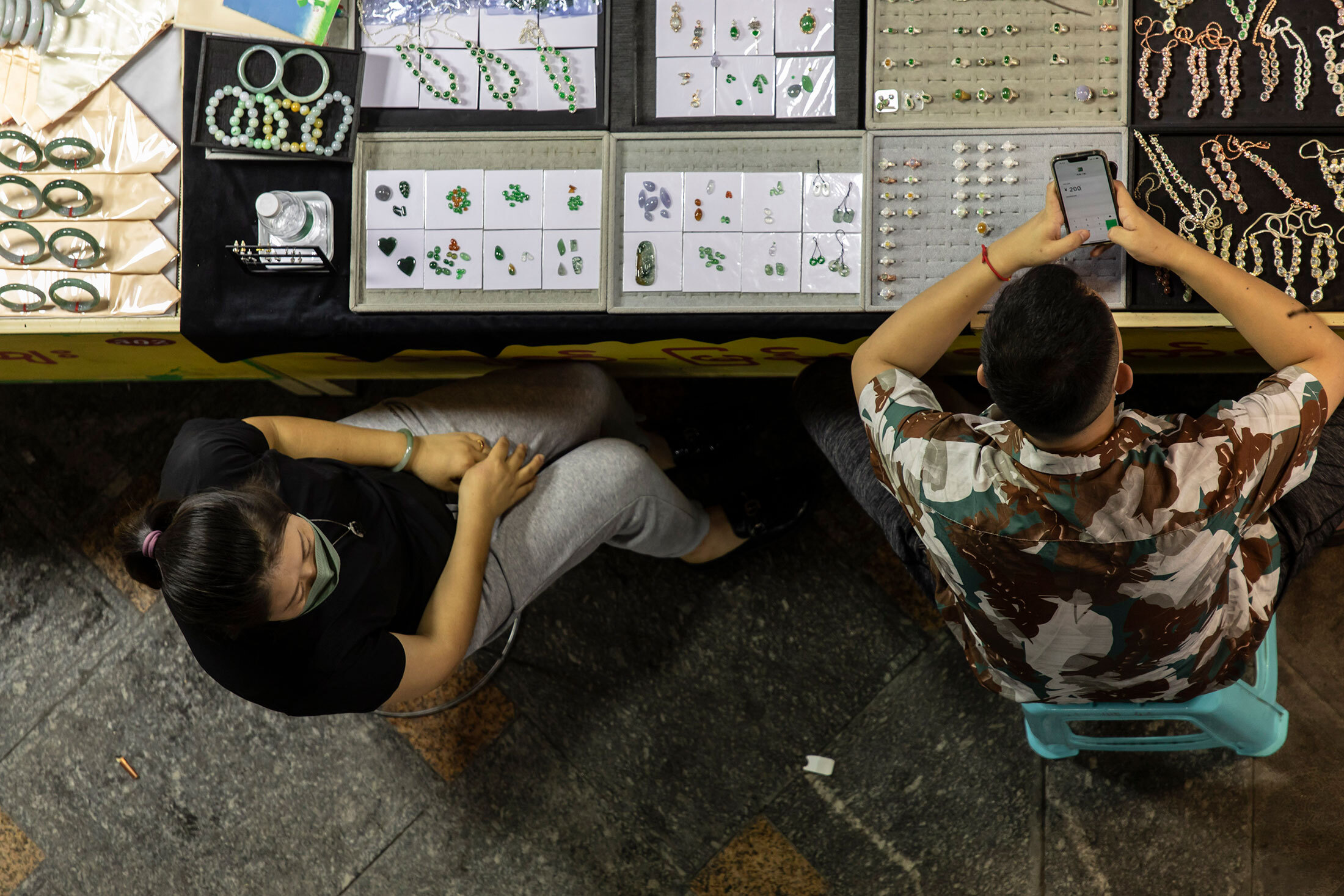 多宝之城市场的宝石交易。摄影师:钱来沈/彭博社除了制造业,瑞丽的经济主要围绕着玉石展开,玉石在中国长期以来一直备受珍视,尤其是用于珠宝。缅甸是世界上最大的玉石生产国,而瑞丽是向北运送货物的传统通道。在多宝之城市场,瑞丽最大的玉石珠宝市场,许多商人在疫情爆发之前已经至少部分转向线上经营,这是社交媒体时代更广泛转型的一部分。玉石经销商已经成为中国一些最热情的直播主播,他们创造了基本上是针对智能手机优化的QVC直播节目,主持人通过聊天功能不断与观众互动。看到你喜欢的手镯了吗?给主持人发信息问任何问题,然后讨价还价,也许会激发一些戏剧性的喊价。玉石销售还具有额外吸引力,因为它们是从拥挤、热闹的市场上直播,提供了一些买家觉得无法抗拒的地方色彩。