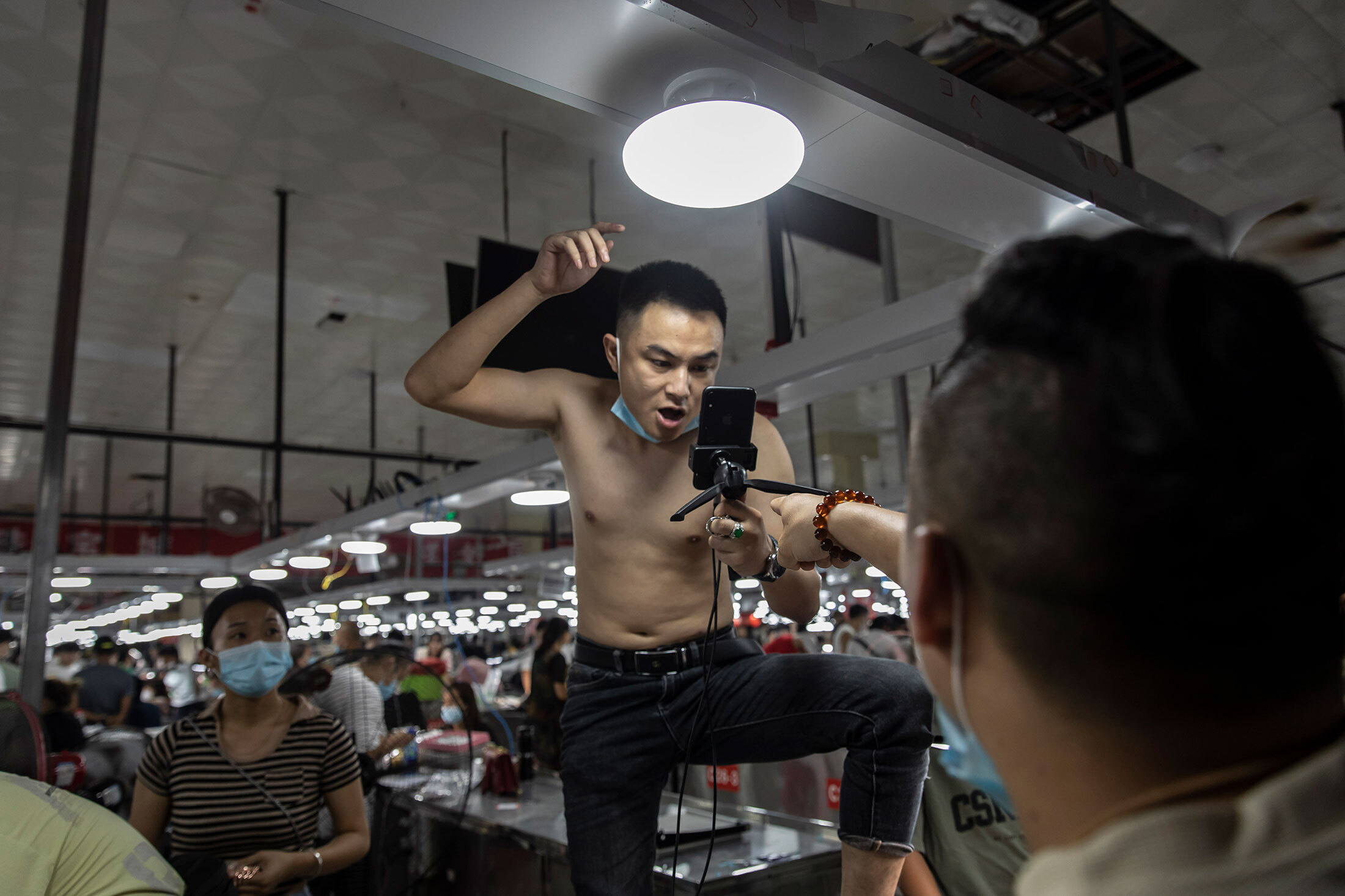 摄影师:钱来沈/彭博社多宝之城市场的一位只提供姓氏李的卖家表示,他起初是从事传统的玉石摊位生意。然后他的女儿在暑假期间尝试了一些直播销售。她一个月赚的钱足以说服她辍学,也让她的父亲不再阻止她。2019年,他们每天卖出多达10万元的玉石,其中70%是在线销售。