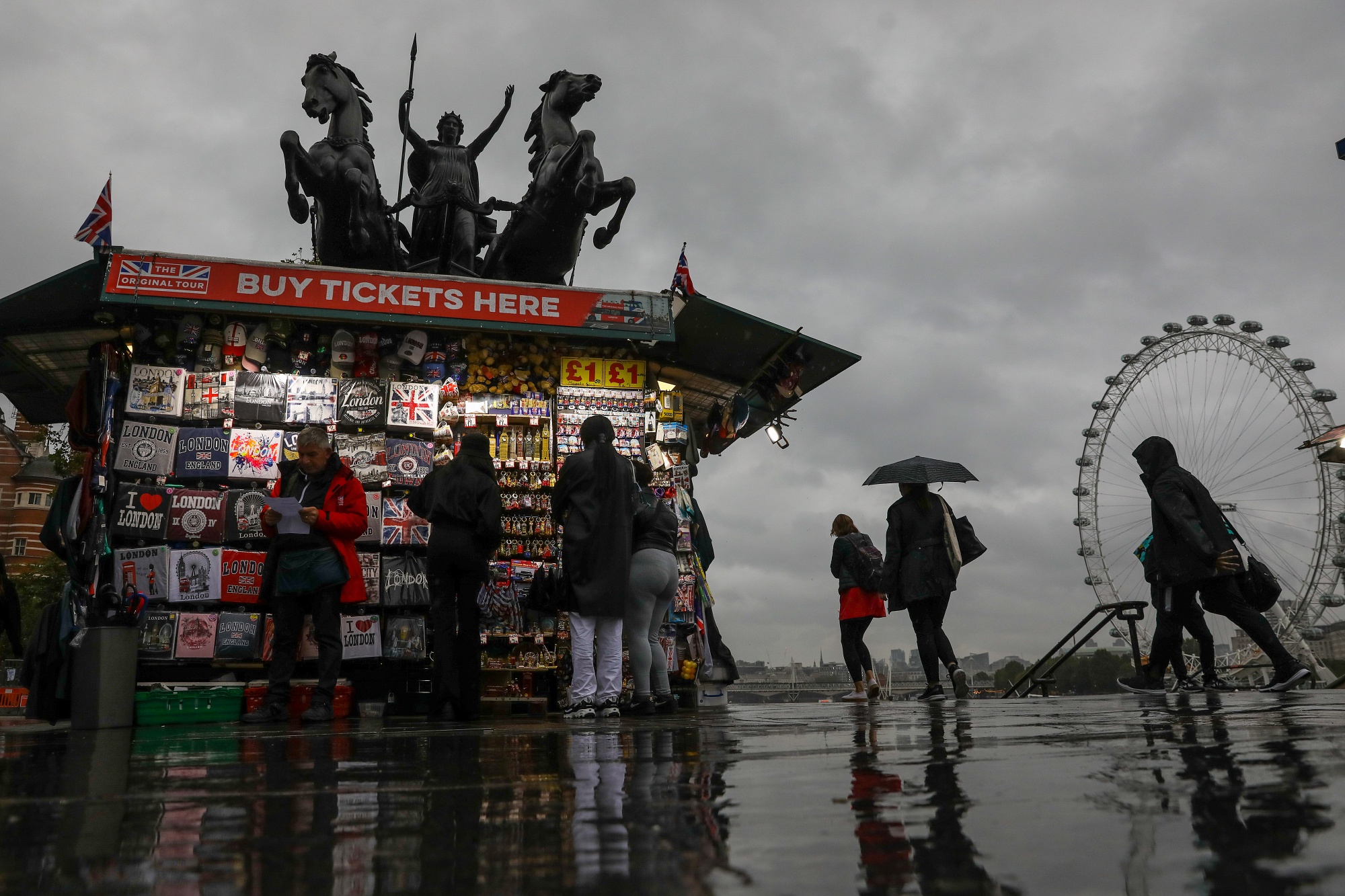 行人走过伦敦威斯敏斯特桥上的一家旅游纪念品摊位。