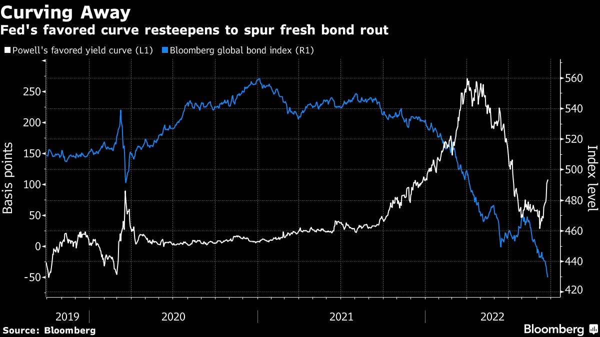 本月全球债券暴跌回归,美联储与此有很大关系。主席杰罗姆·鲍威尔在8月底的杰克逊霍尔会议上明确表示,他们希望收益率显著提高,以帮助遏制通货膨胀,现在他们已经完全做到了。这激发了一系列收益率曲线措施要么进一步倒挂,要么变得更加负面,这促使一些投资者“希望”即将到来的衰退会减缓美联储及其同行的步伐。问题在于鲍威尔似乎坚持另一个曲线指标,即当前三个月票据利率与交易员预期18个月后的利率之间的差距,他在3月份强调这是一个更真实的衰退指标。