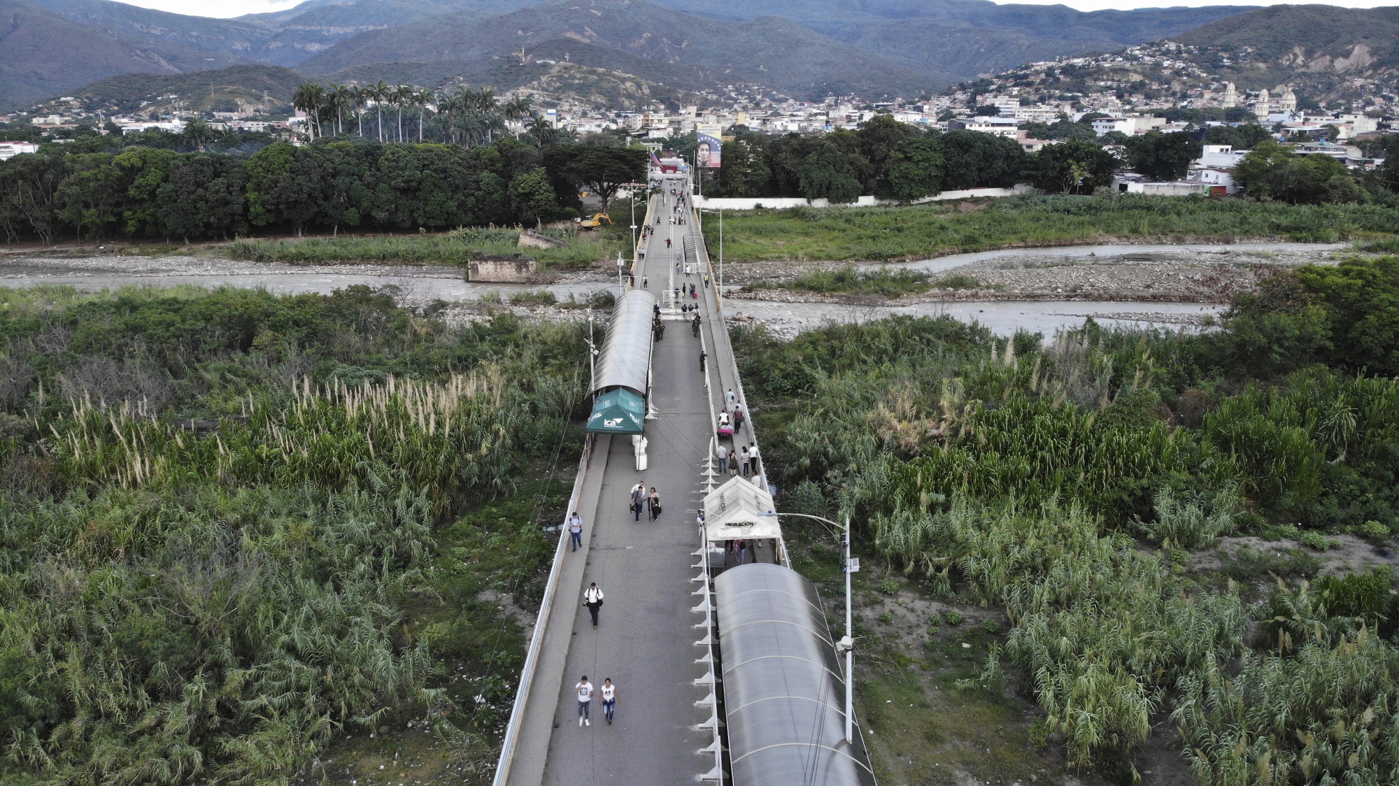 步行者在委内瑞拉塔奇拉靠近哥伦比亚边境的西蒙·玻利瓦尔国际大桥上穿行,时间为8月7日。