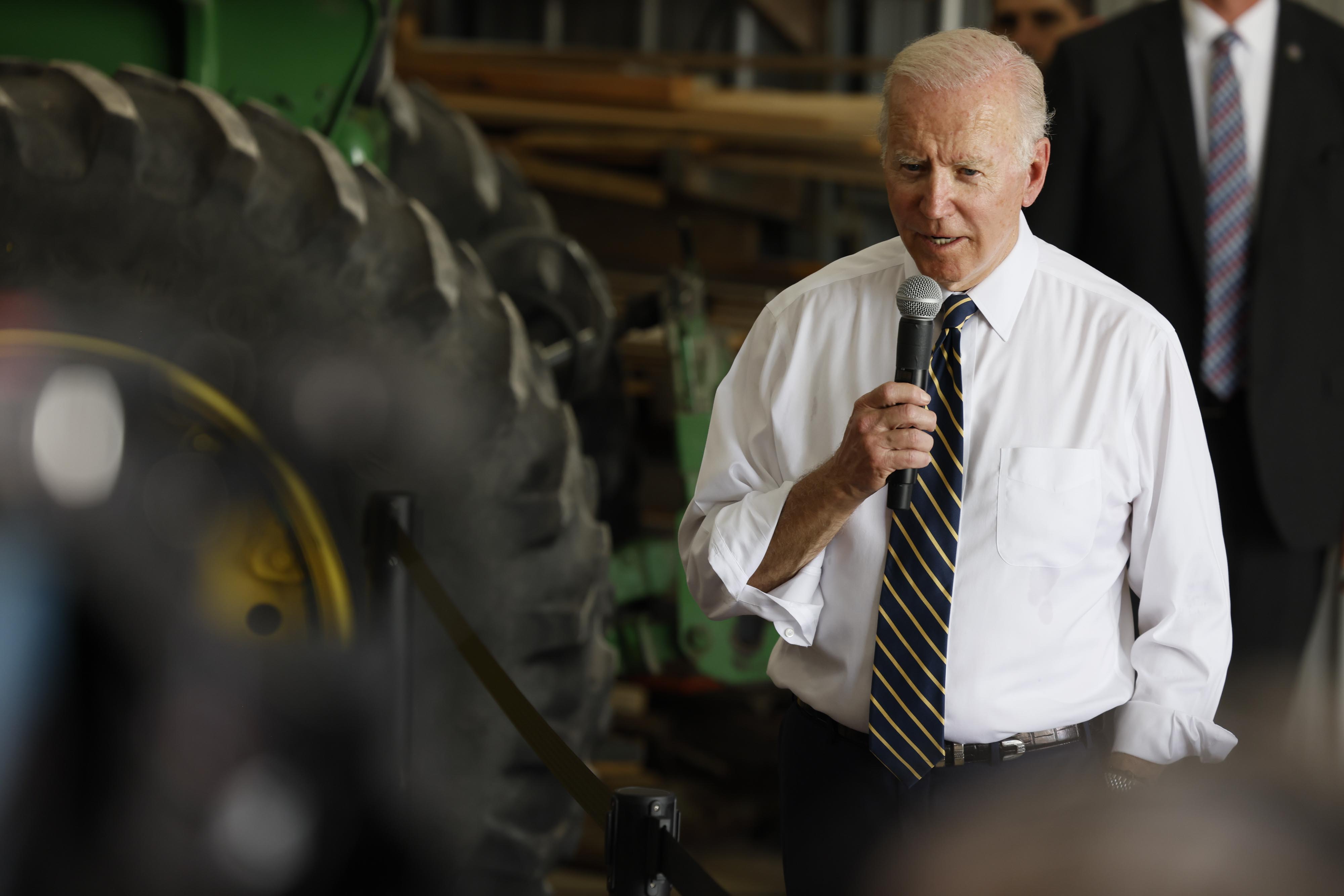 总统乔·拜登在伊利诺伊州坎卡基的一个家庭农场访问时发表讲话,时间是五月。