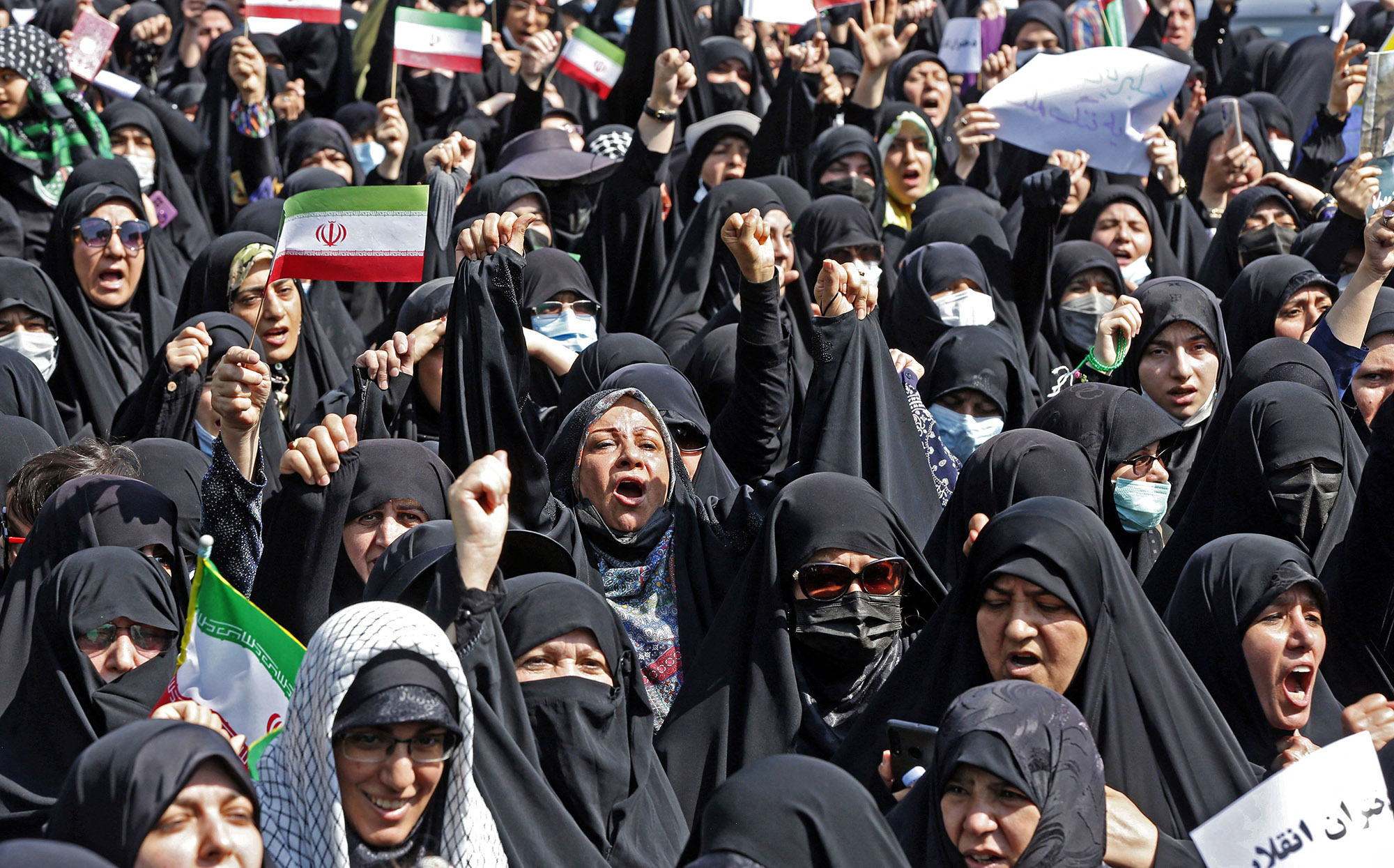 伊朗人挥舞国旗,参加9月23日在德黑兰举行的支持戴头巾的游行。 图片:法新社通过盖蒂图片社 另请阅读: 欧盟要求伊朗结束对抗议者的暴力镇压