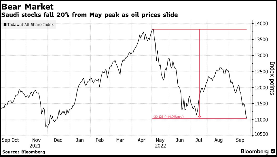 情绪恶化: 沙特股市成为海湾地区首个进入熊市的股市,油价暴跌使情绪恶化,结束了近两年的表现优异。