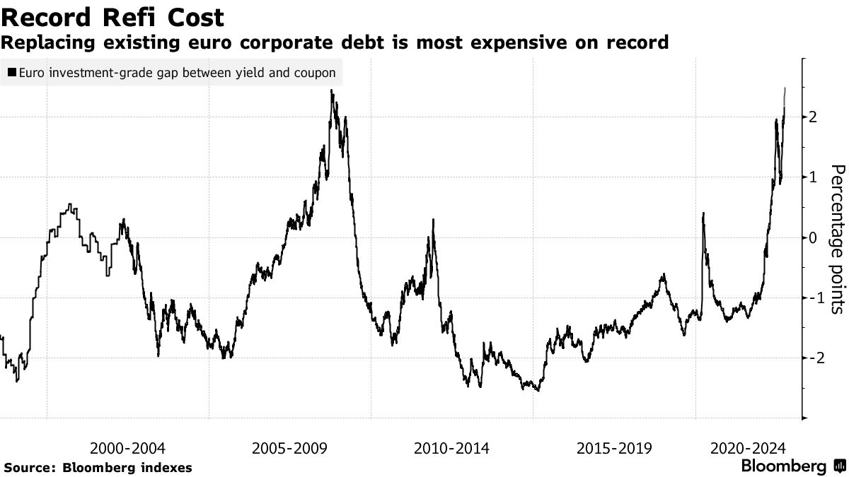 欧洲公司面临创纪录的成本来 refinancing 他们的债务*。如果他们现在出售债券,需要支付的差额与现有债务的票面利率相比上升到250个基点,这是自1998年彭博指数开始以来最高的。换句话说,公司需要为每借出1亿欧元额外支付250万欧元。*