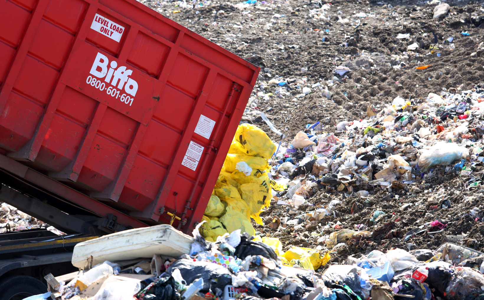 一辆Biffa垃圾车将垃圾运送到英国雷德希尔附近的垃圾填埋场。