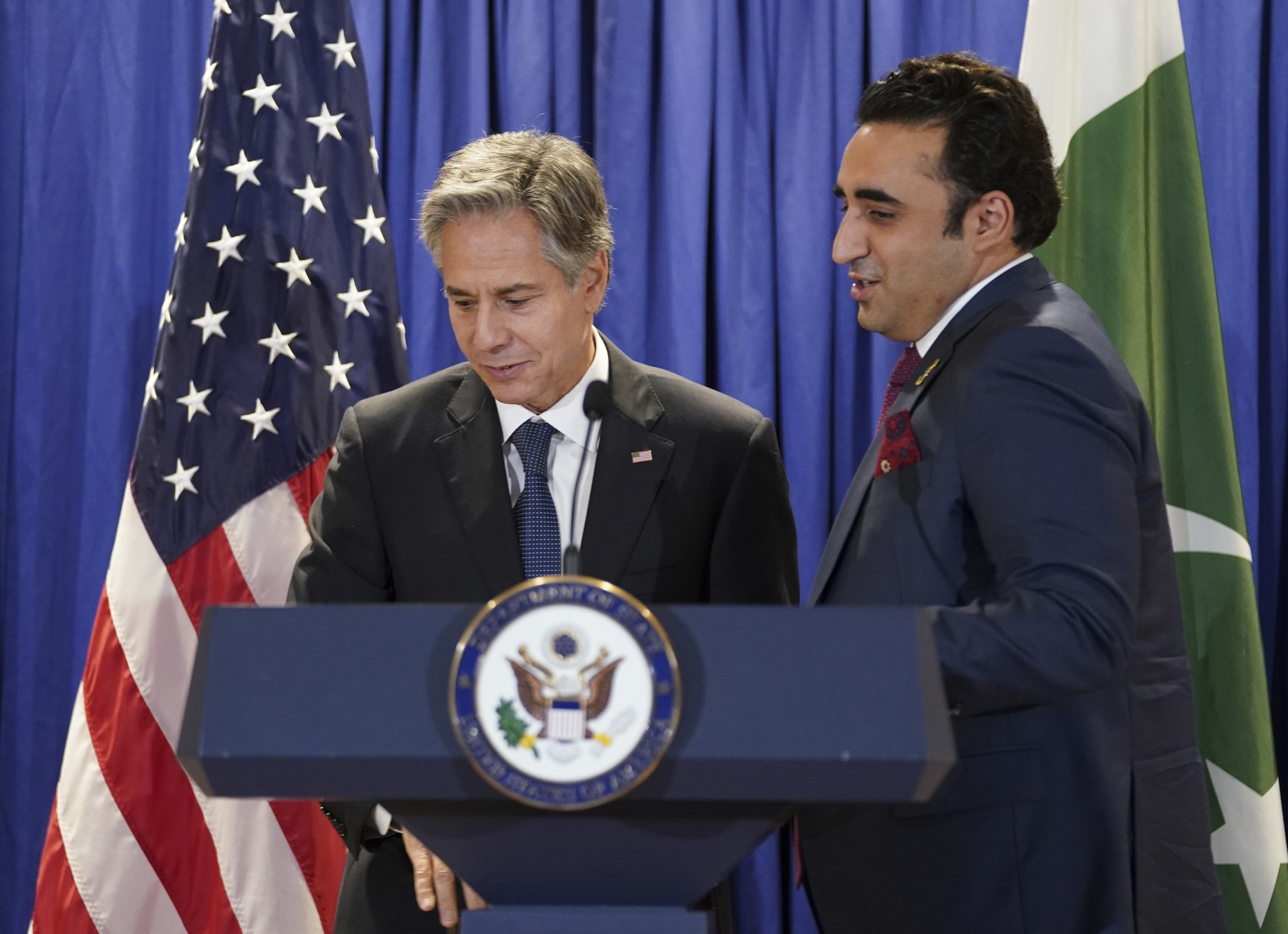 美国国务卿安东尼·布林肯和巴基斯坦外长比拉瓦尔·布托-扎尔达里在星期一会晤后交换位置发表讲话,2022年9月26日,华盛顿国务院。(凯文·拉马克/美联社摄)