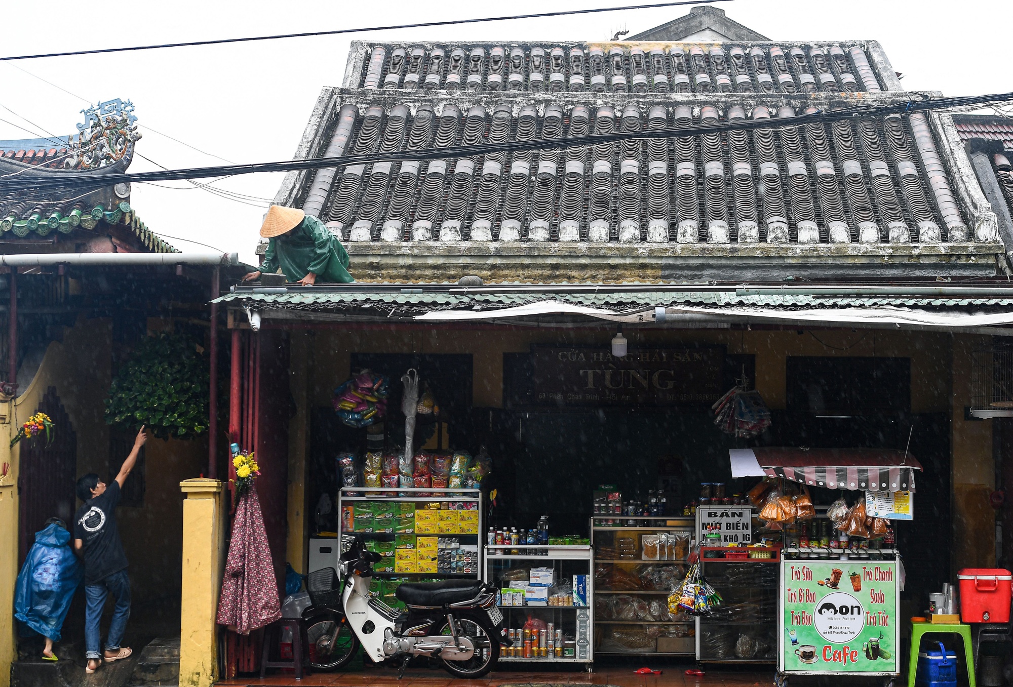 居民在台风诺鲁即将抵达越南广南会安之前加固建筑物的屋顶,时间为9月27日。