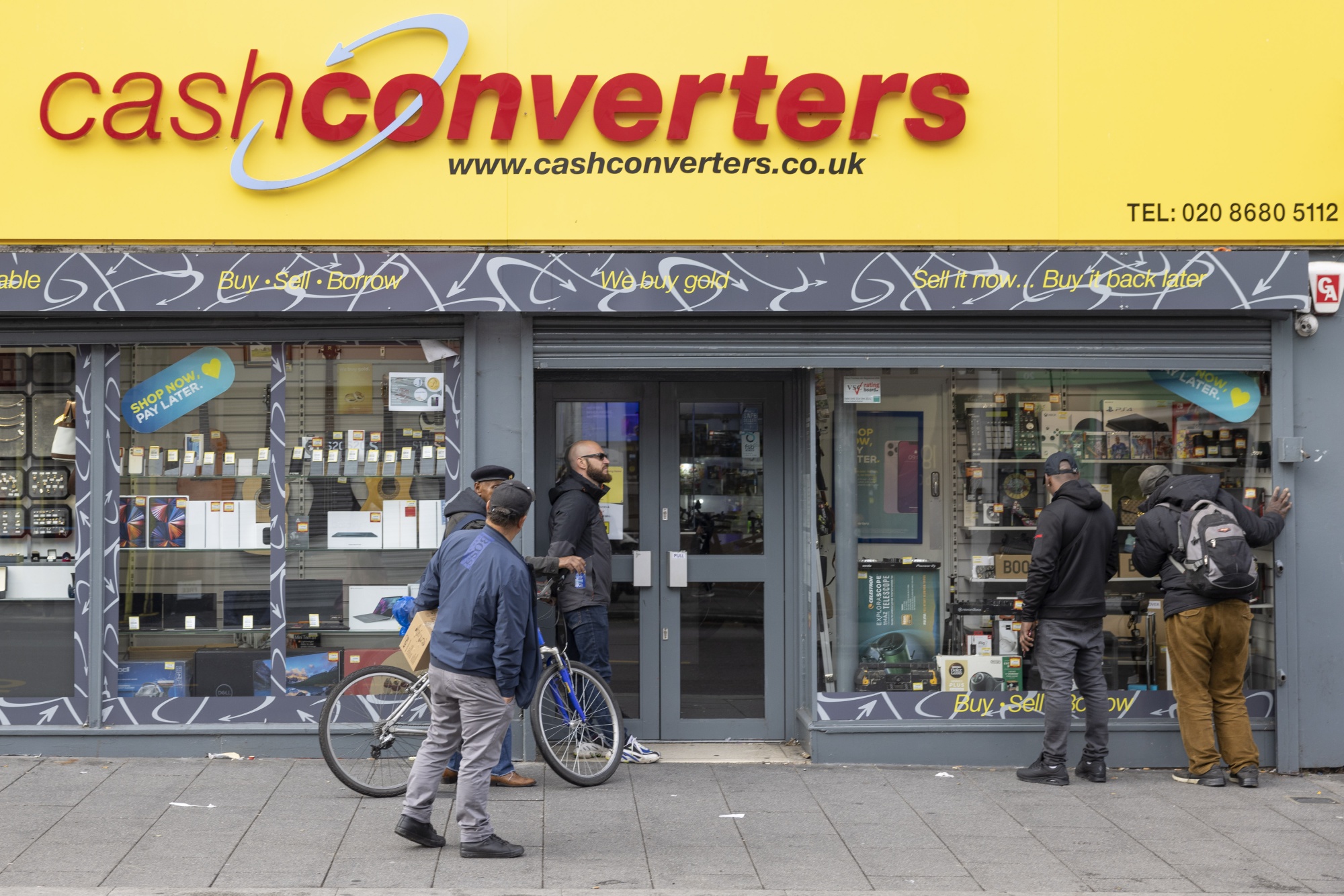 顾客们在星期一早上在克罗伊登一家当铺店开门之前等待。
