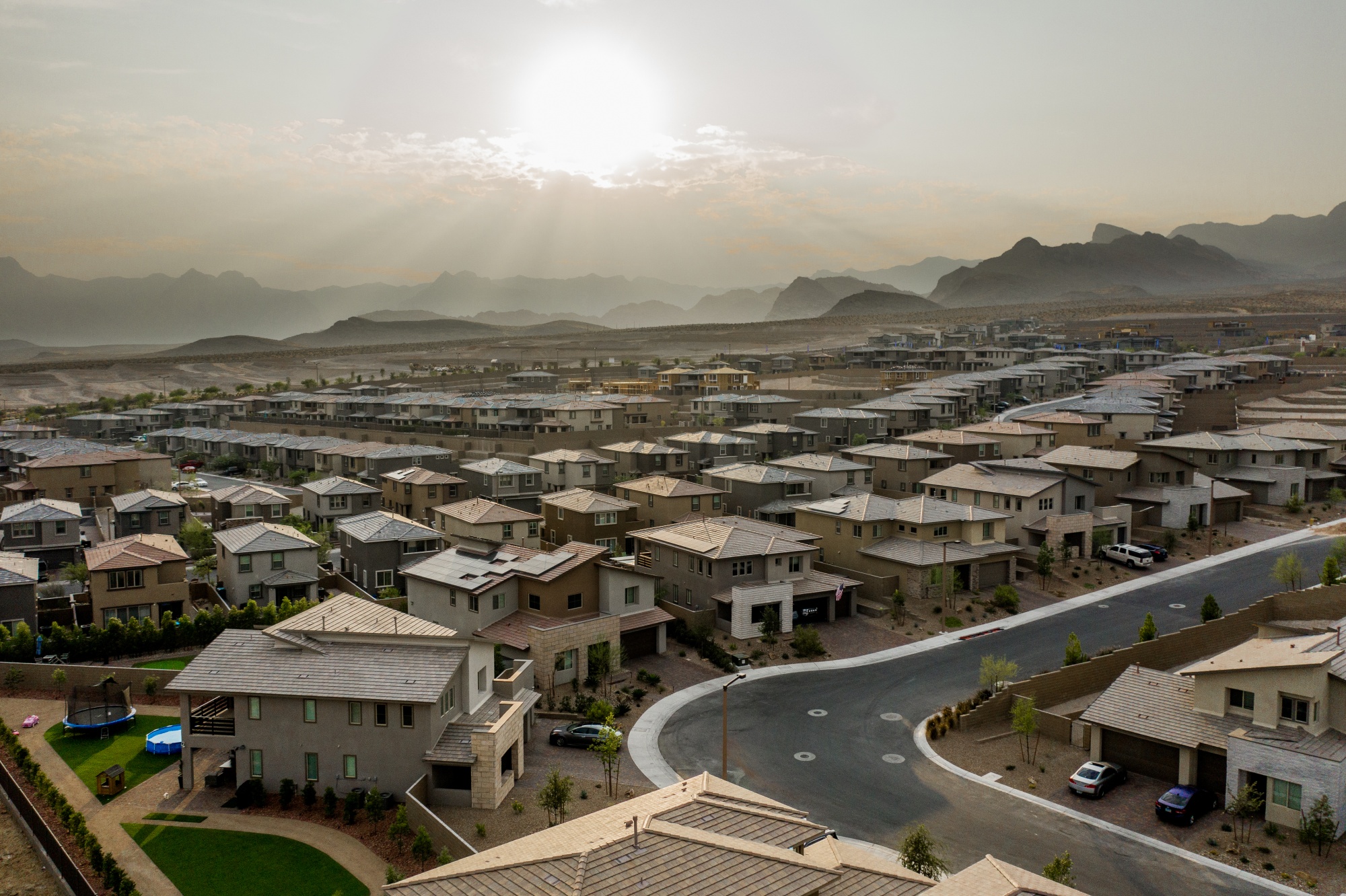单户住宅在拉斯维加斯外的Summerlin社区的沙漠中蔓延。摄影师:Roger Kisby/Bloomberg像旧金山和洛杉矶这样的加利福尼亚城市仍在失去居民,尽管失去的速度比疫情期间缓慢了,而南内华达州继续吸引新移民。2020年7月至2021年间,约有1.9万新移民搬到了拉斯维加斯,而在Summerlin,仍有约5000英亩待开发。这种增长速度引发了可持续性警报:拉斯维加斯正面临日益减少的供水和日益增多的高温天数,因为气候变化正在重塑西南部。但当与Schorr的无边泳池旁晒太阳时,与会者被劝告不要为此问题感到紧张。