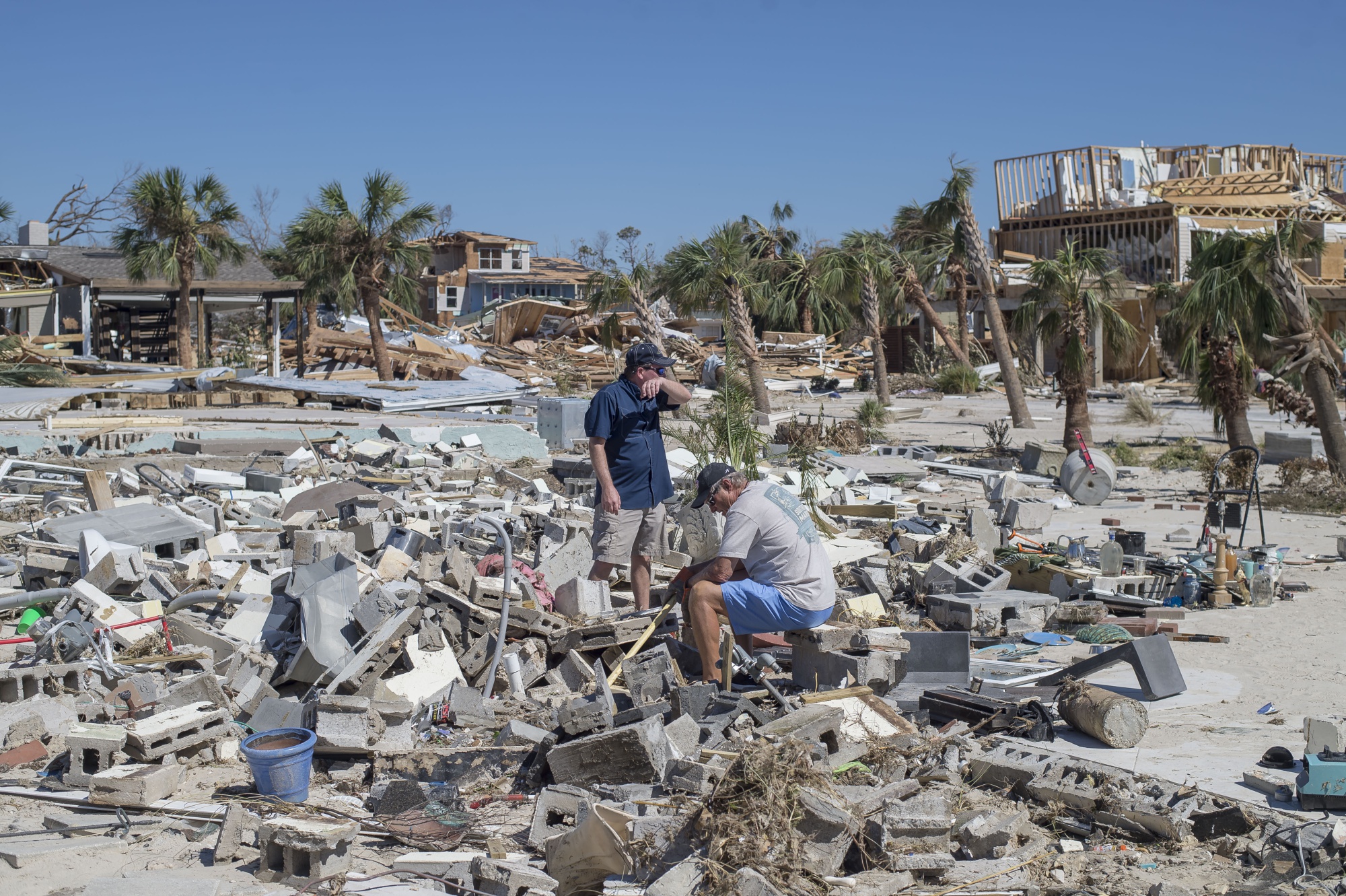 飓风迈克尔袭击佛罗里达州墨西哥海滩后,居民们在残骸中进行调查,时间为2018年10月12日。