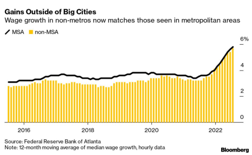像远程办公和从昂贵城市迁出的趋势有助于促进曾经陷入困境的地区的发展,包括倾向于投票共和党的农村地区。所谓的紫色州,即两党都有机会获胜的州,拥有所有州中最强劲的就业复苏,尽管也倾向于拥有最高的通货膨胀率。