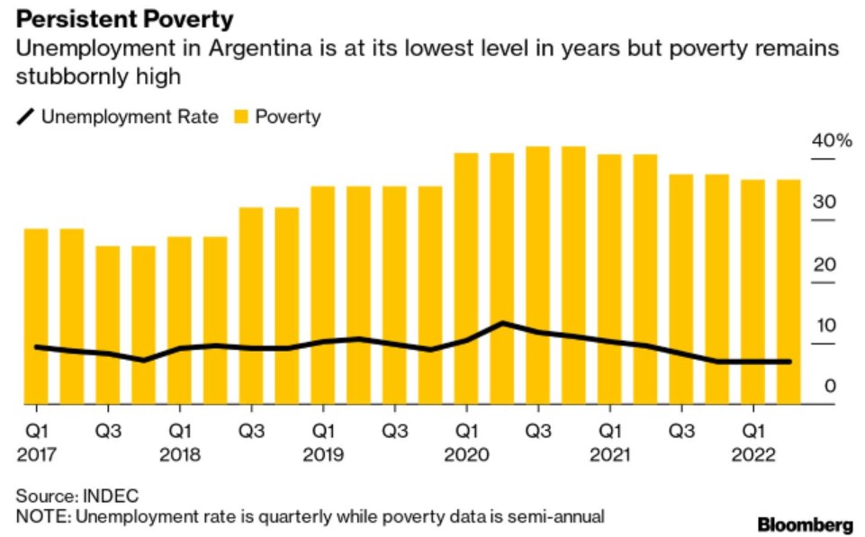 根据政府数据,今年上半年阿根廷的贫困率为36.5%,比疫情前高出整整一个百分点,正如Patrick Gillespie在这里写的那样。跌入贫困线意味着无法负担基本生活必需品的购买,前景看起来更加黯淡。
