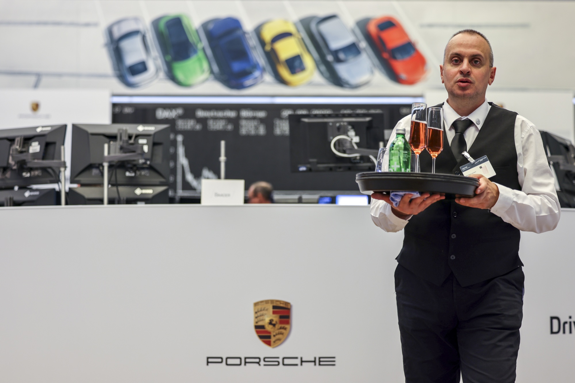 一名工人在德国法兰克福证券交易所内运送饮料,该交易所由德国波尔斯集团运营,此前进行了保时捷股份公司的首次公开募股(IPO)。摄影师:Alex Kraus/Bloomberg
