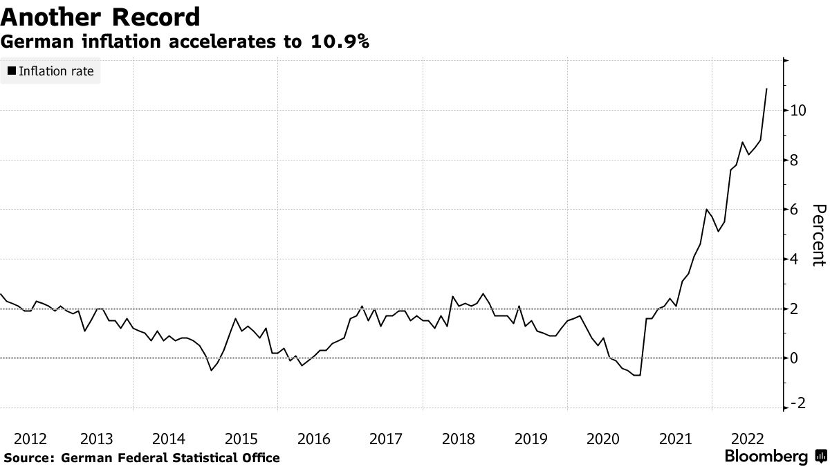 德国通货膨胀首次在欧元时代达到两位数,在临时政府救助措施结束和欧洲能源危机加剧后激增超出预期。为了应对不断上涨的能源成本,该国正在限制天然气价格。