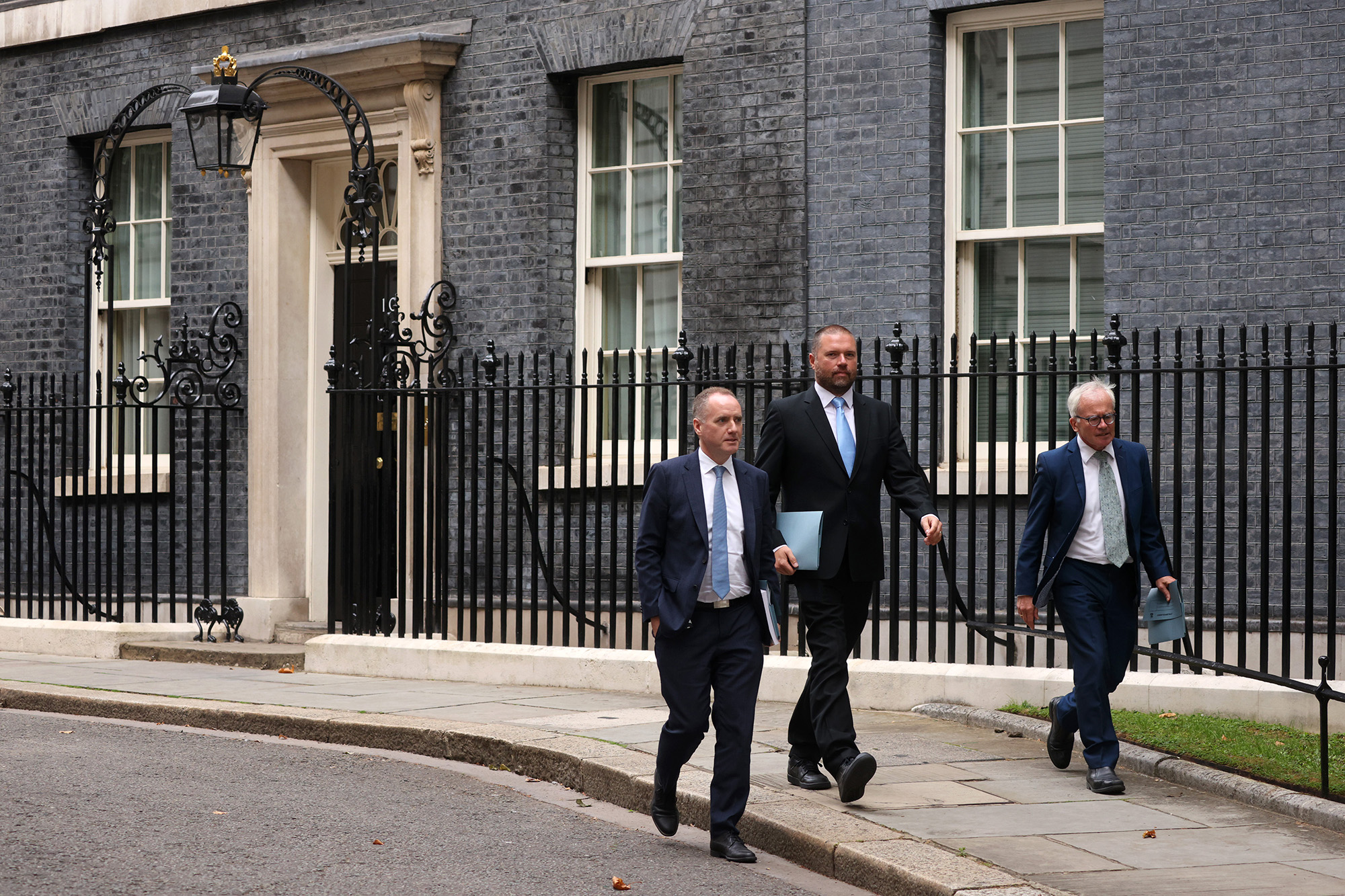OBR主席理查德·休斯(Richard Hughes)(左)、安迪·金(Andy King)(中)和大卫·迈尔斯教授(Professor David Miles)在9月30日与利兹·特拉斯(Liz Truss)会面后离开唐宁街。