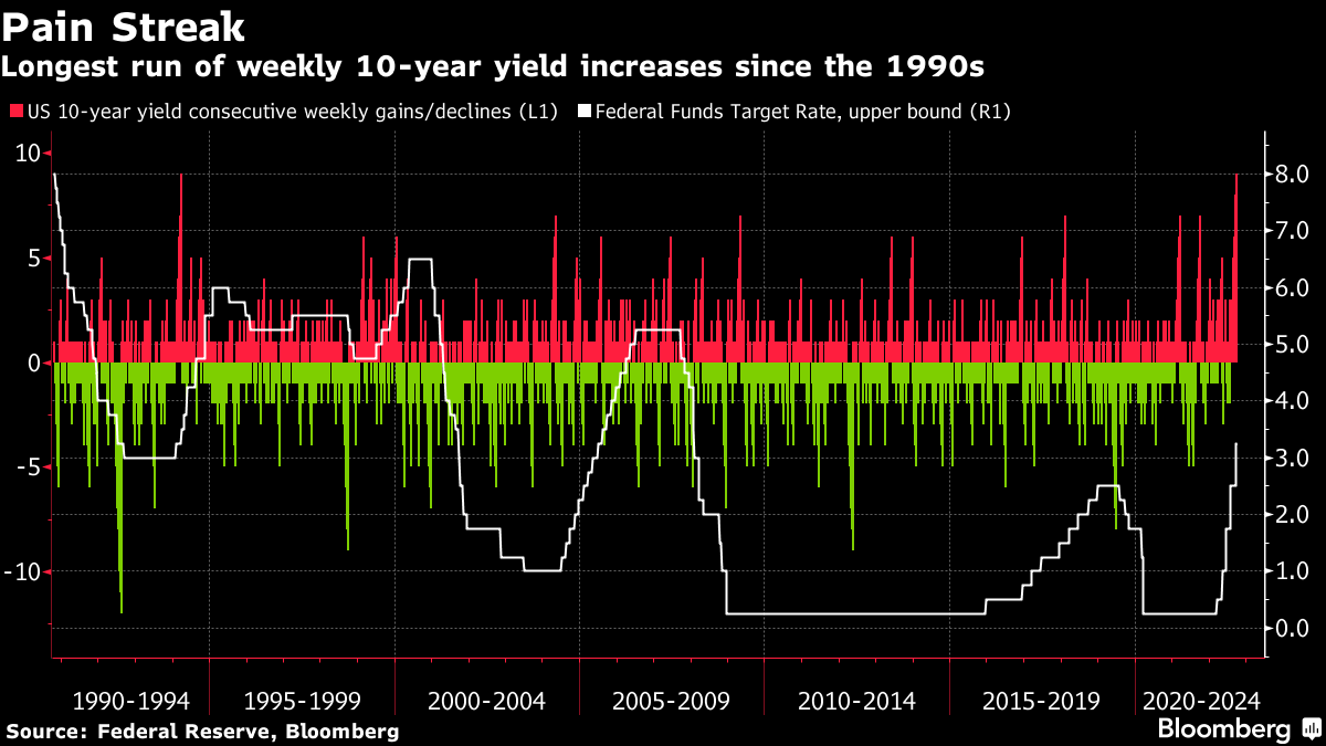 国债十年期收益率正在以一种罕见的方式持续飙升。它们连续第九周上涨,这是自1994年初以来最长的连续上涨,这段时间内上涨了1.18个百分点。这次债券抛售是自四五月份暴跌以来最激烈的一次,当时收益率在九周内上涨了1.4个百分点,但其持续性是显而易见的。