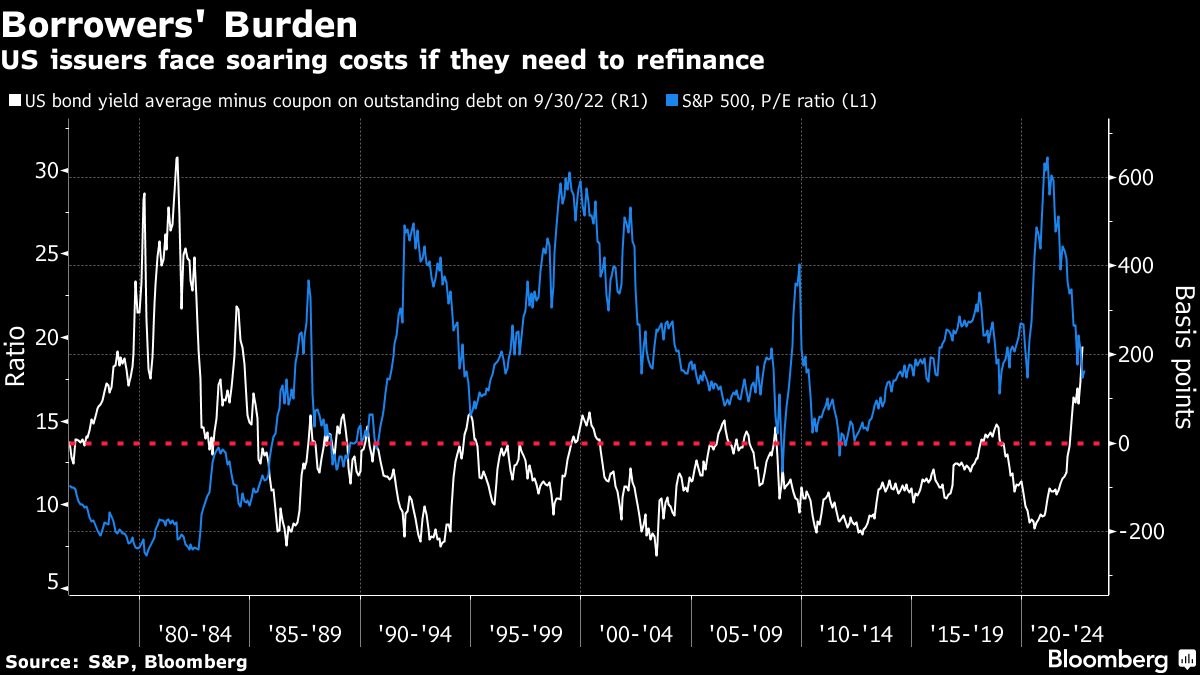 美联储鹰派政策的高峰似乎还有一段时间,但即使到年底停止,仍然有很多真实的经济痛苦需要考虑。例如,一家美国公司或政府财务主管现在想发行新票据,可能需要支付的利息平均比现有证券的票面利率高出约217个基点。这是40年来迄今为止最高的。