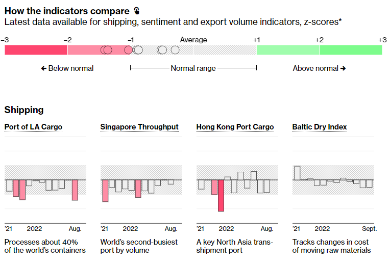 最近的恶化趋势表现在 Bloomberg贸易追踪器 上的 10 个主要指标的位置,所有这些指标目前都低于其平均水平,其中四个处于“低于正常”水平。(点击 这里 查看最新数据。)
