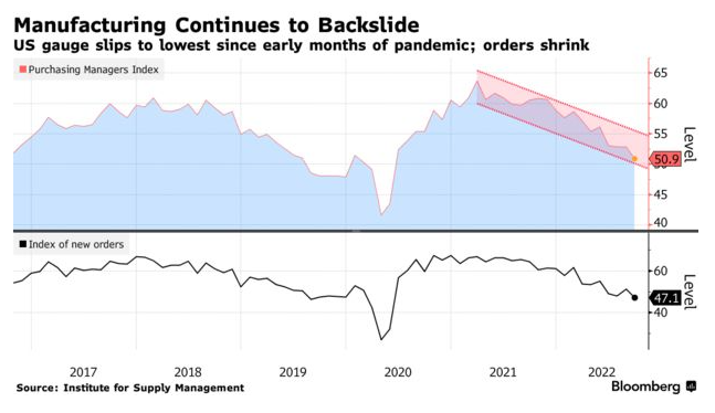 工厂陷入困境 | 美国制造业的一个指标在9月份跌至两年多来的最低点,接近完全停滞,随着订单在过去四个月中第三次收缩。根据周一发布的数据,供应管理协会的工厂活动指数下降了近2个百分点,至50.9,为2020年5月以来的最低水平。50的读数分隔扩张和收缩,而9月的结果低于经济学家在彭博调查中的52的中值预测。(阅读完整故事请点击 这里*。)*