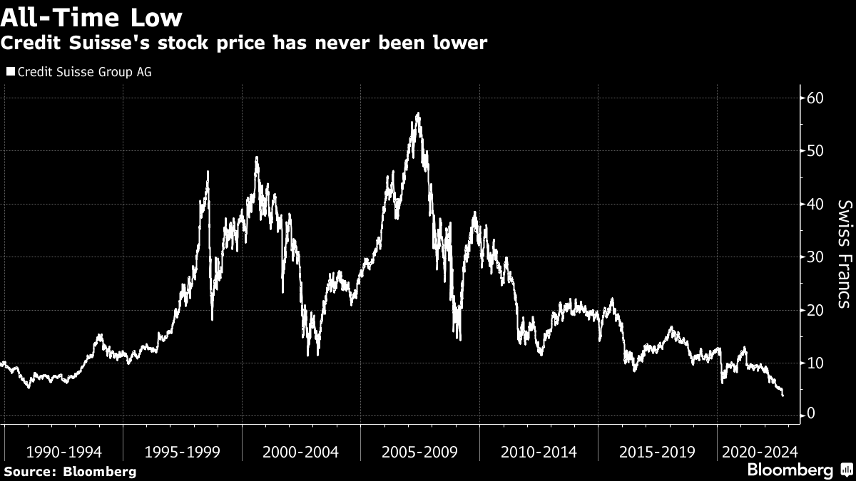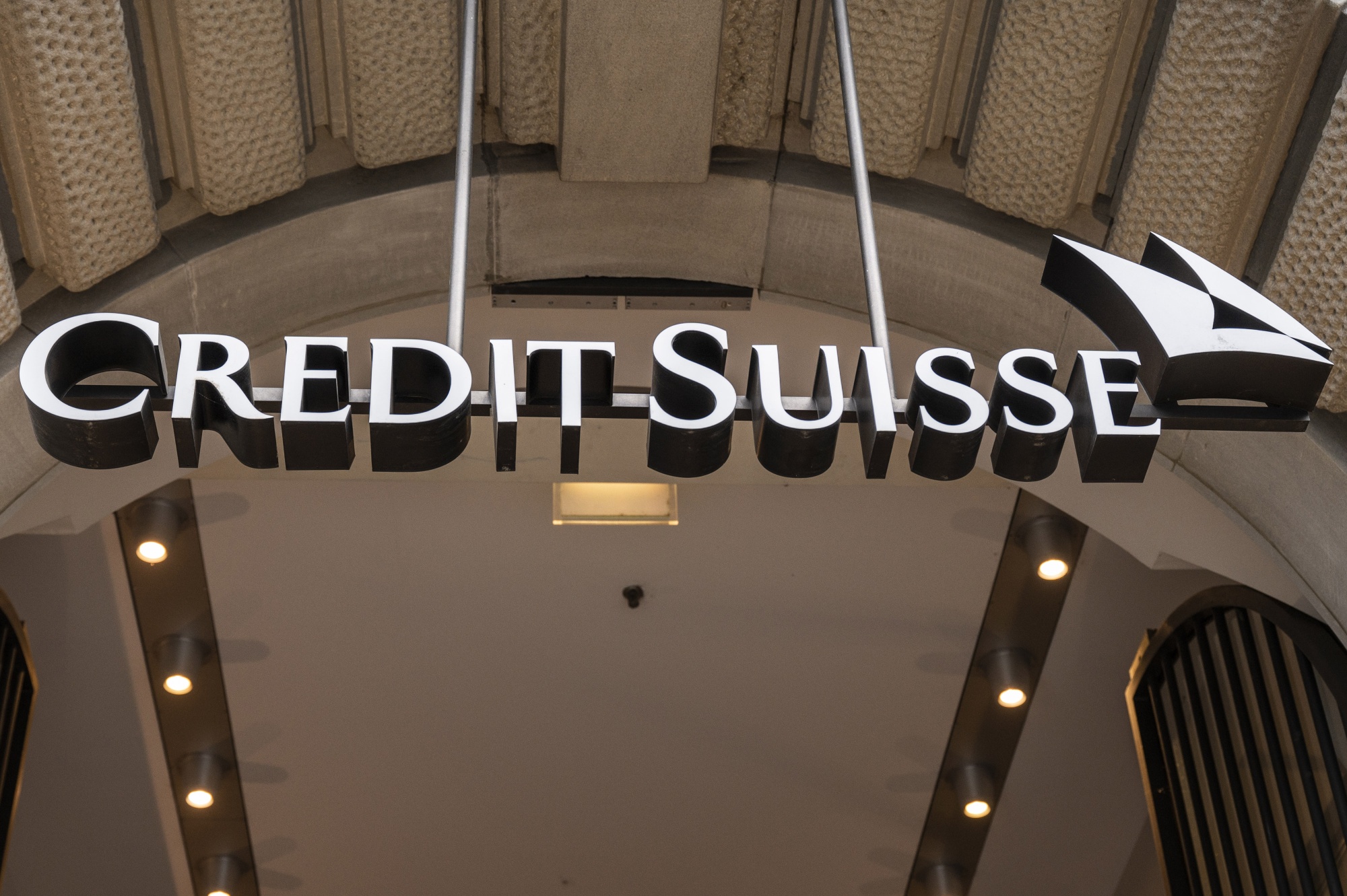 标志悬挂在瑞士苏黎世的瑞士信贷集团分支机构入口上。对这家瑞士巨头的担忧是全球出现问题迹象的其中之一,这让投资者相信央行鹰派政策即将达到顶峰。