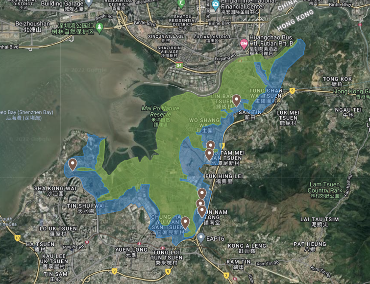 有许多申请要在蓝色阴影下的湿地缓冲区建造住宅楼。绿色区域代表湿地保护区。来源:Google 地图新鸿基地产集团发言人在一份声明中表示,现在大部分缓冲区是“废弃荒地或生态价值低下的鱼塘”,并支持“积极管理的湿地与规划良好的发展平衡混合”。他补充说,对于缓冲区内的先前项目,开发商采用了设计以促进自然风流,包括在住宅和湿地之间设有大片绿地,并设计了最大程度减少对湿地影响的施工过程。