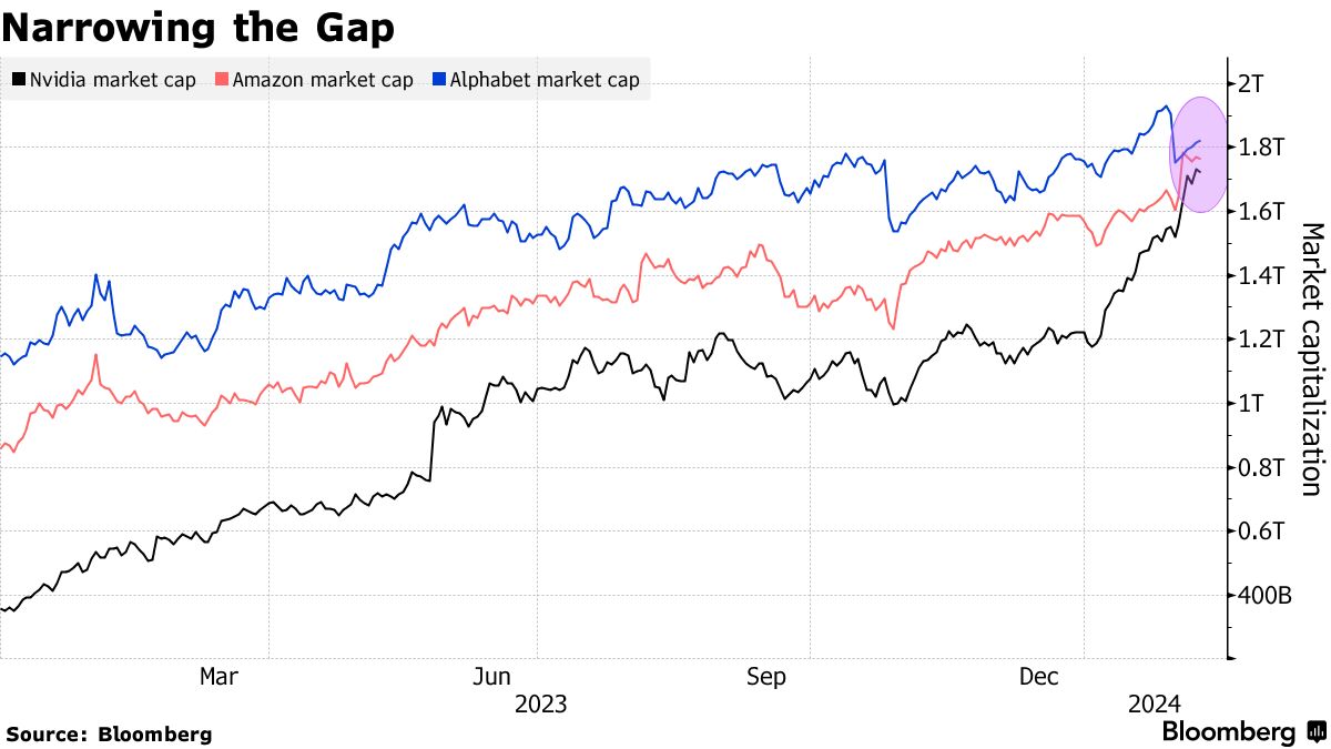 在过去两个月中,英伟达公司的市值几乎增加了整个特斯拉公司的市值,目前英伟达市值为1.74万亿美元,仅略低于亚马逊的1.77万亿美元。谷歌母公司字母表(Alphabet)是美国第三大市值公司,仅次于微软和苹果,市值为1.83万亿美元。