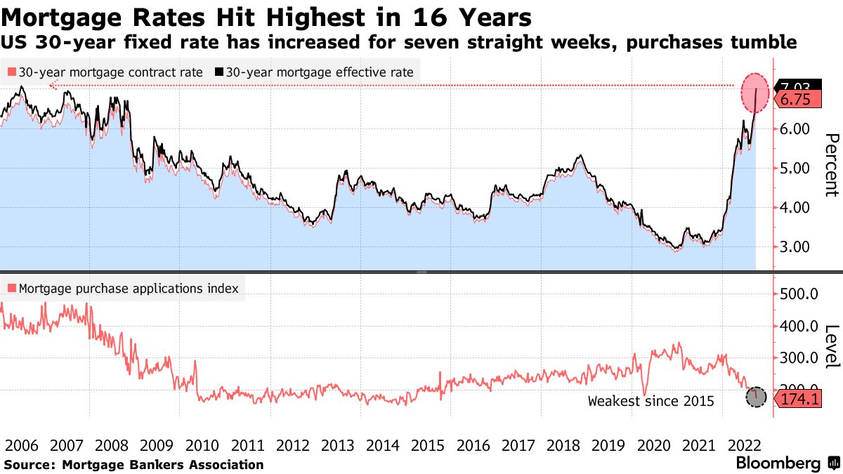 - 美国30年期固定抵押贷款平均利率连续第七周上涨,本周达到6.75%。这是 16年来 最高的