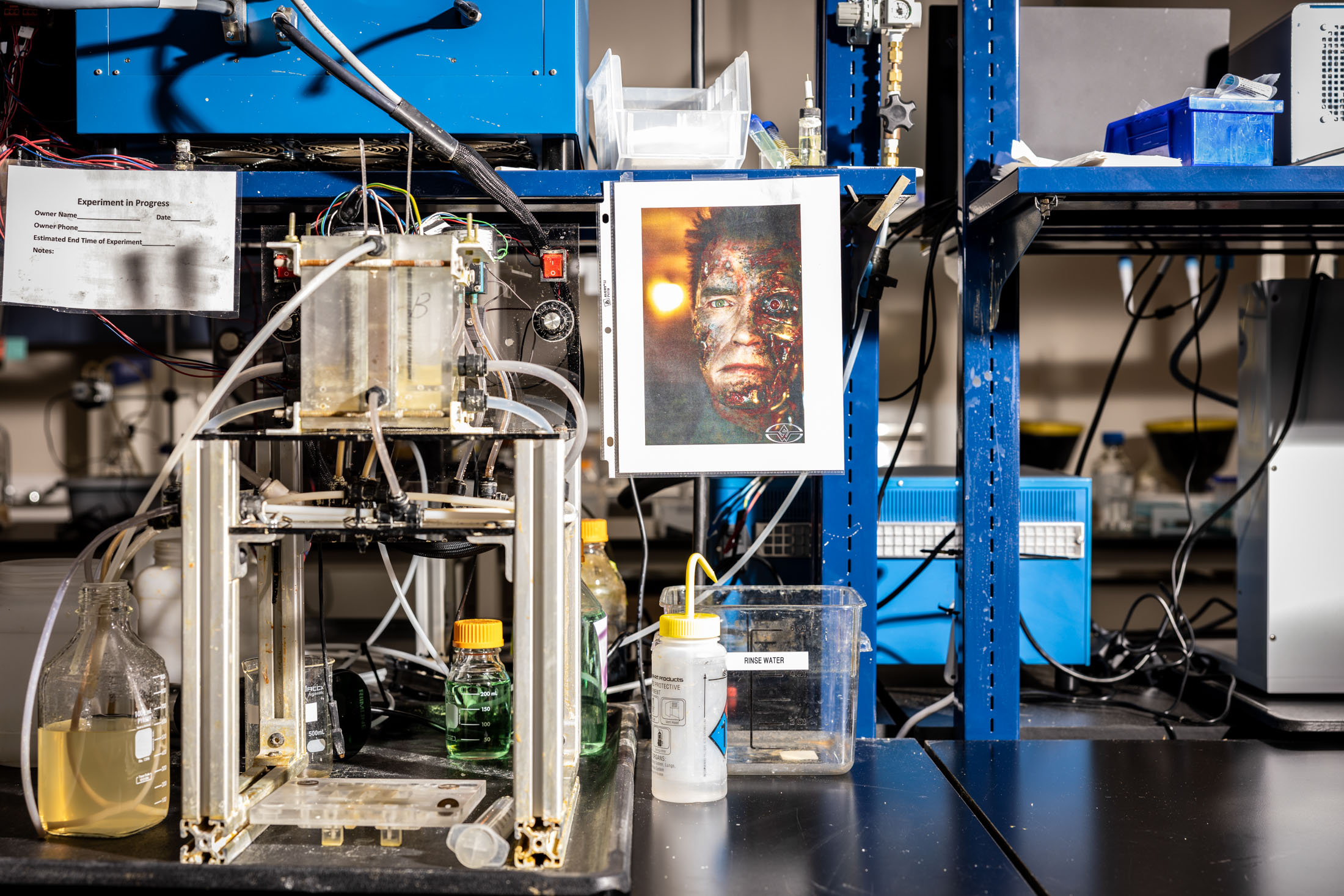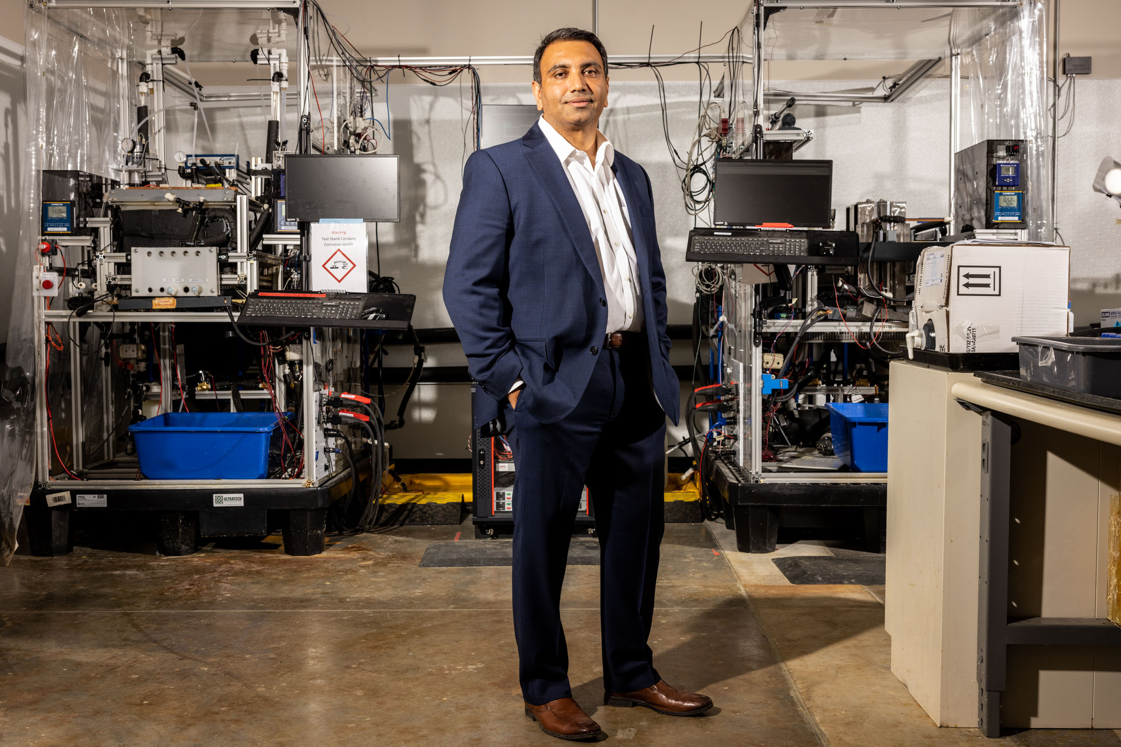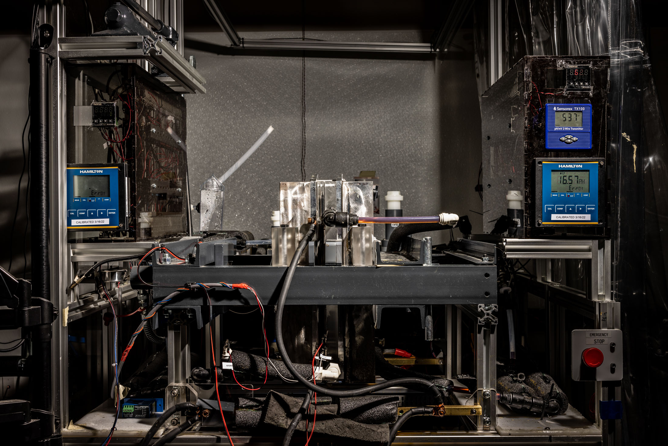 Electra实验室内的测试装置,旁边是阿诺德·施瓦辛格的照片。据Electra高级科学家Colleen Wallace称,这个装置被昵称为“阿诺德”,因为它“举铁”。摄影师:Chet Strange“Electra设法完成了一项困难的转化,只使用电力就将氧化铁转化为铁,而且在如此低的温度下,” 卡内基梅隆大学副教授Venkat Viswanathan说。“他们采取的步骤让铁以恰到好处的状态。”