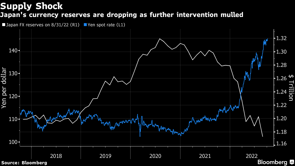 另一个问题是日本外汇储备的急剧下降,截至8月31日今年已下降了8%。储备仍然相当可观,达到1.17万亿美元,但由于每天的美元兑日元交易额达到8710亿美元,干预的有效性存在限制。还有一个担忧是,如果再发生类似上个月200亿美元购买日元的情况,日本将耗尽储备中的现金。那么它将不得不开始主动出售国债,这将带来进一步的美国收益率飙升和日元进一步走弱的风险。