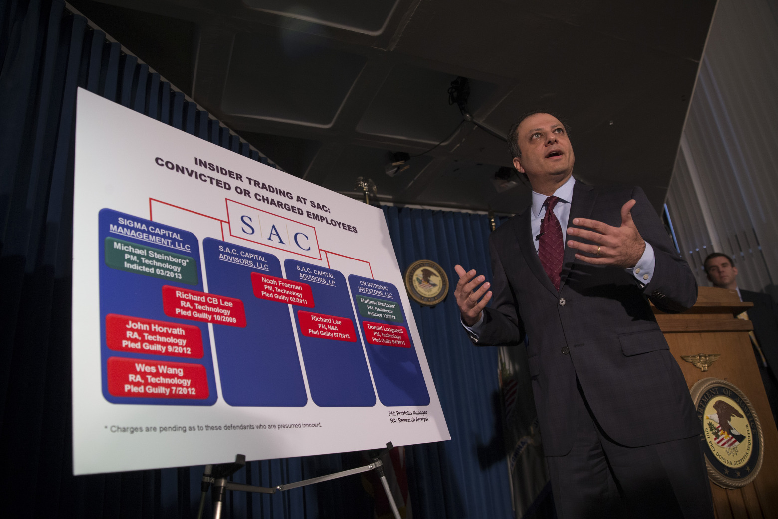 普里特·巴拉拉在2013年7月25日在纽约举行的新闻发布会上宣布对SAC员工提出指控。摄影师:斯科特·伊尔斯/彭博社在公司认罪后,他将公司更名为Point72,归还客户资金,并使用自己的财富进行交易。到2018年初,他又开始为外部投资者管理资金。