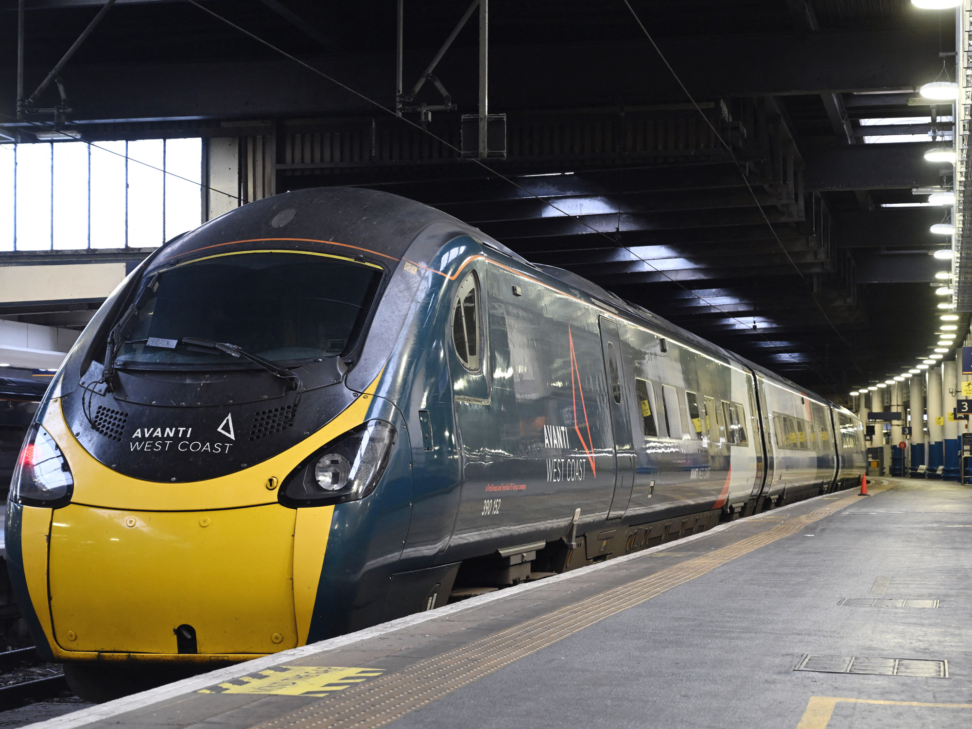 一列Avanti West Coast列车停靠在伦敦的尤斯顿站。