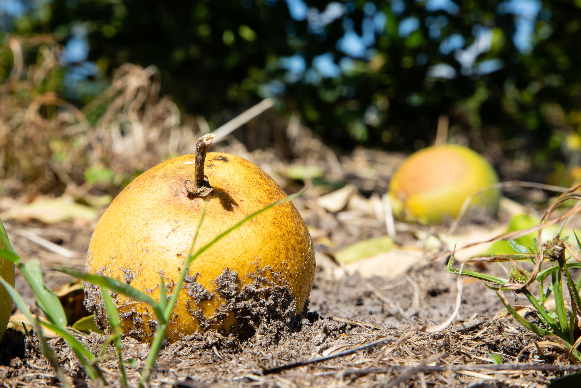 佛罗里达飓风伊恩过后地面上的落下的橙子。