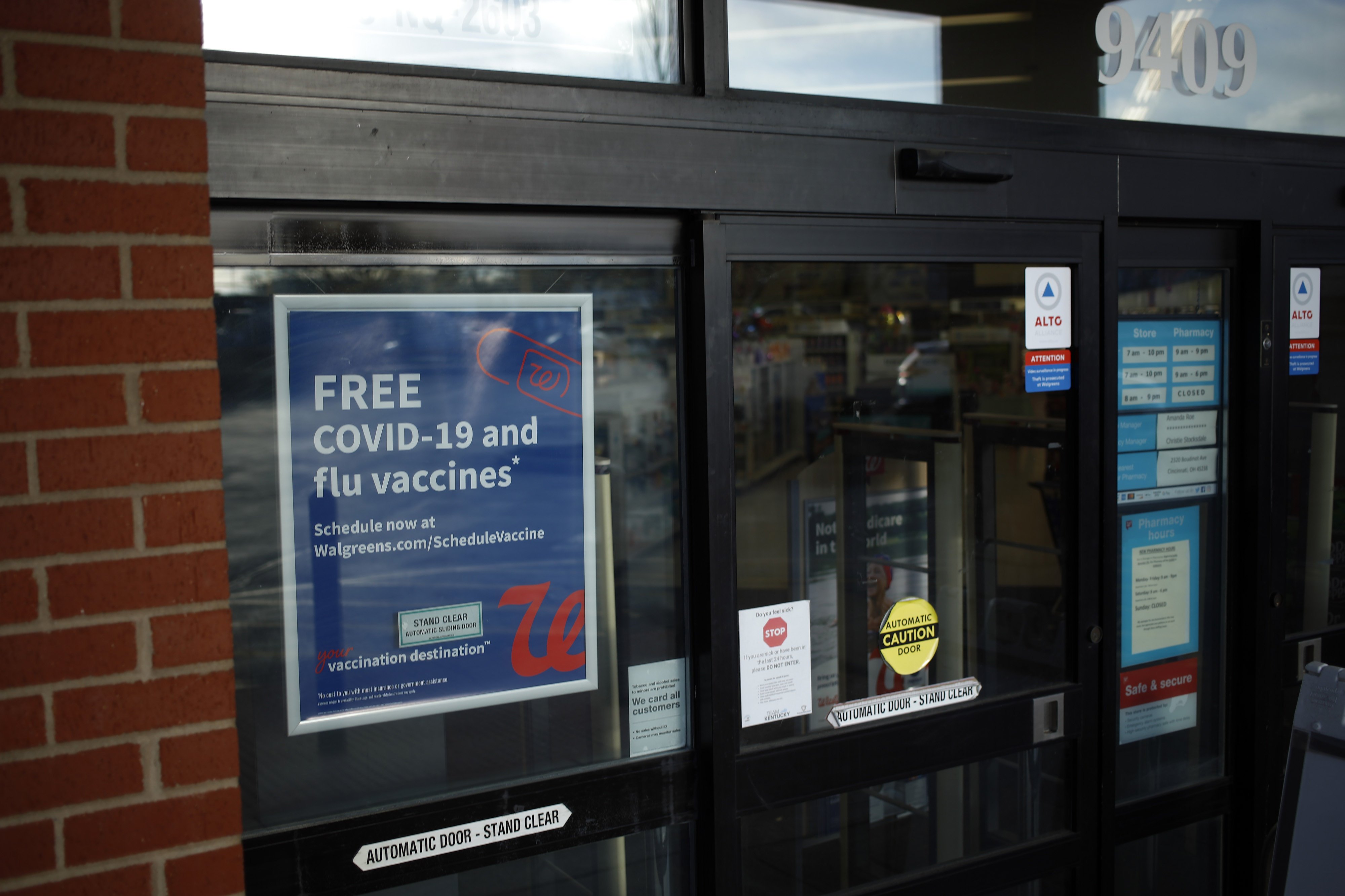 一则标志向顾客提供免费的新冠疫苗和流感疫苗,地点在美国肯塔基州路易斯维尔的沃尔格林药店,拍摄于2022年3月24日。