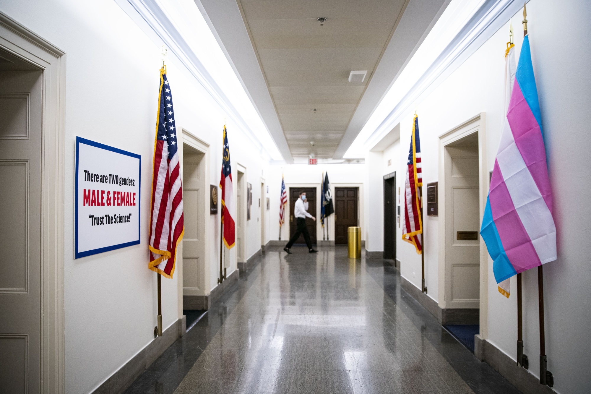 一面标牌挂在国会山外的众议员玛乔里·泰勒·格林(R-GA)办公室外墙上,而一面跨性别骄傲旗帜挂在众议员玛丽·纽曼(D-IL)(R)办公室外。