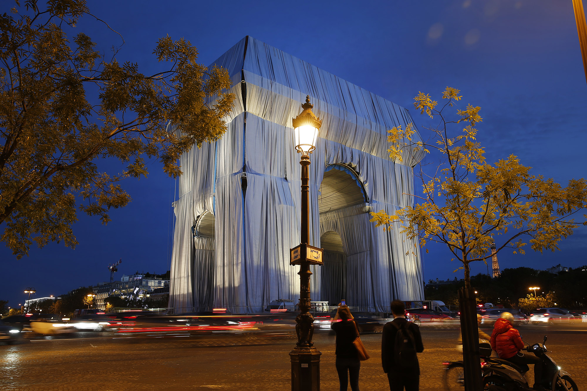 这些剩下的作品之一——凯旋门,包裹——于2021年9月执行。克里斯托的团队在巴黎的纪念碑上悬挂了超过270,000平方英尺的闪亮银蓝色织物,这是一个极具争议性的项目,需要1,600名工人,导致交通混乱数周,并吸引了600万游客。