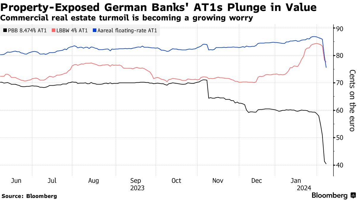 对PBB的担忧已经蔓延到其他具有商业房地产暴露的银行。德国Aareal银行AG债券在过去两天已经下跌了约10个点,现在报价为欧元的76分。去年11月,该银行报告称,美国不良贷款的价值比前一年增长了四倍多。