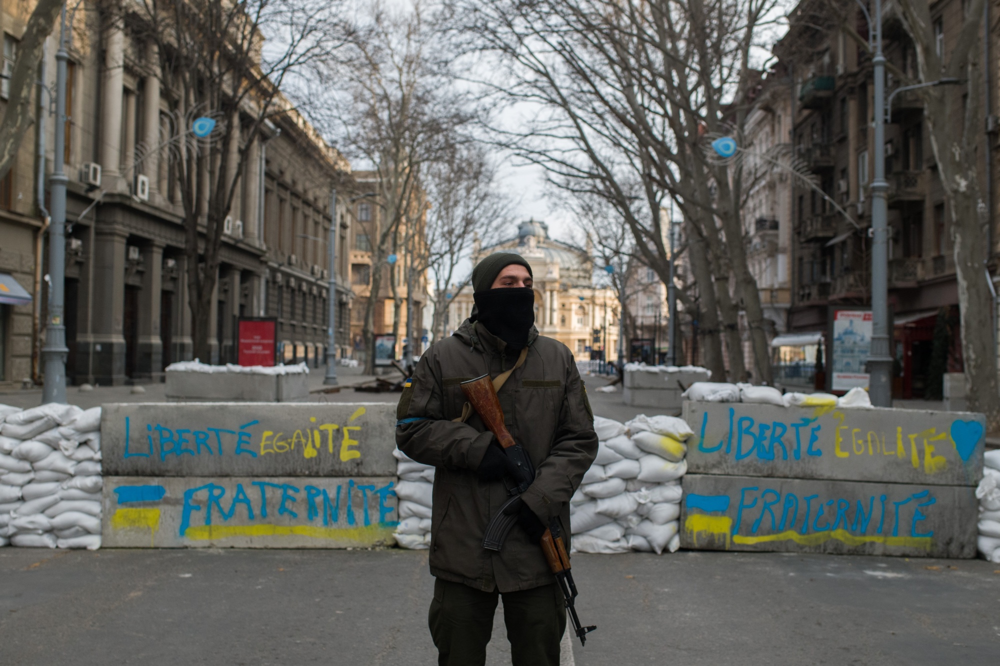 乌克兰士兵在乌克兰敖德萨的一个检查站。摄影师:Nathan Laine/Bloomberg