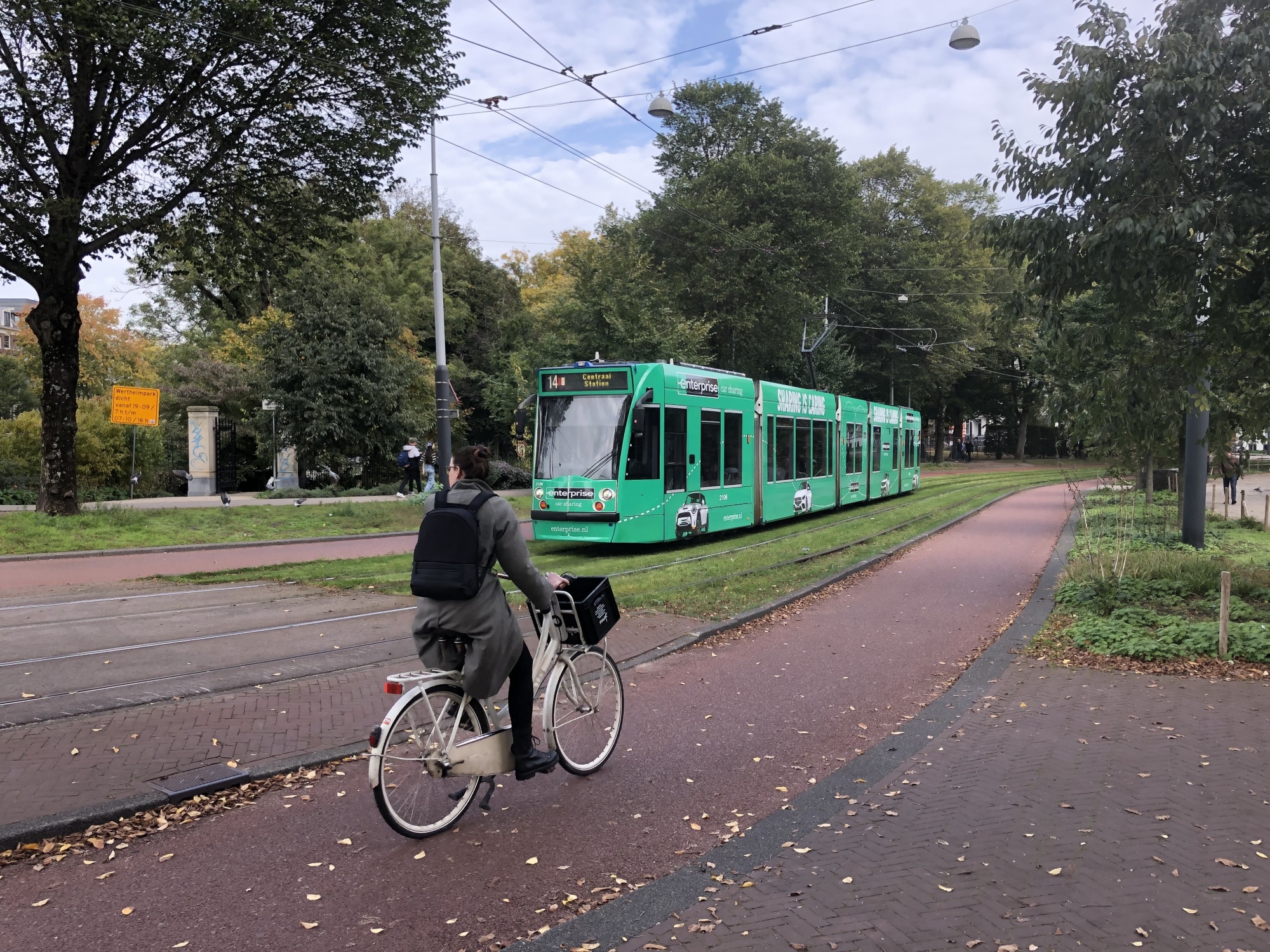 城市规定努力对新的微移动变体进行规范;尽管新规定禁止滑板车和微型汽车进入自行车道,但有些仍然侵占。我们试图加入在阿姆斯特尔火车站附近不断增多的通勤者流中时,经历了一些棘手的时刻;电动自行车和滑板车的骑手们在我们这群黑色自行车周围飞驰。但道路网络的基本逻辑,将主要机动车辆交通引导到有限通行的高速公路上,使我们保持了秩序和直立。