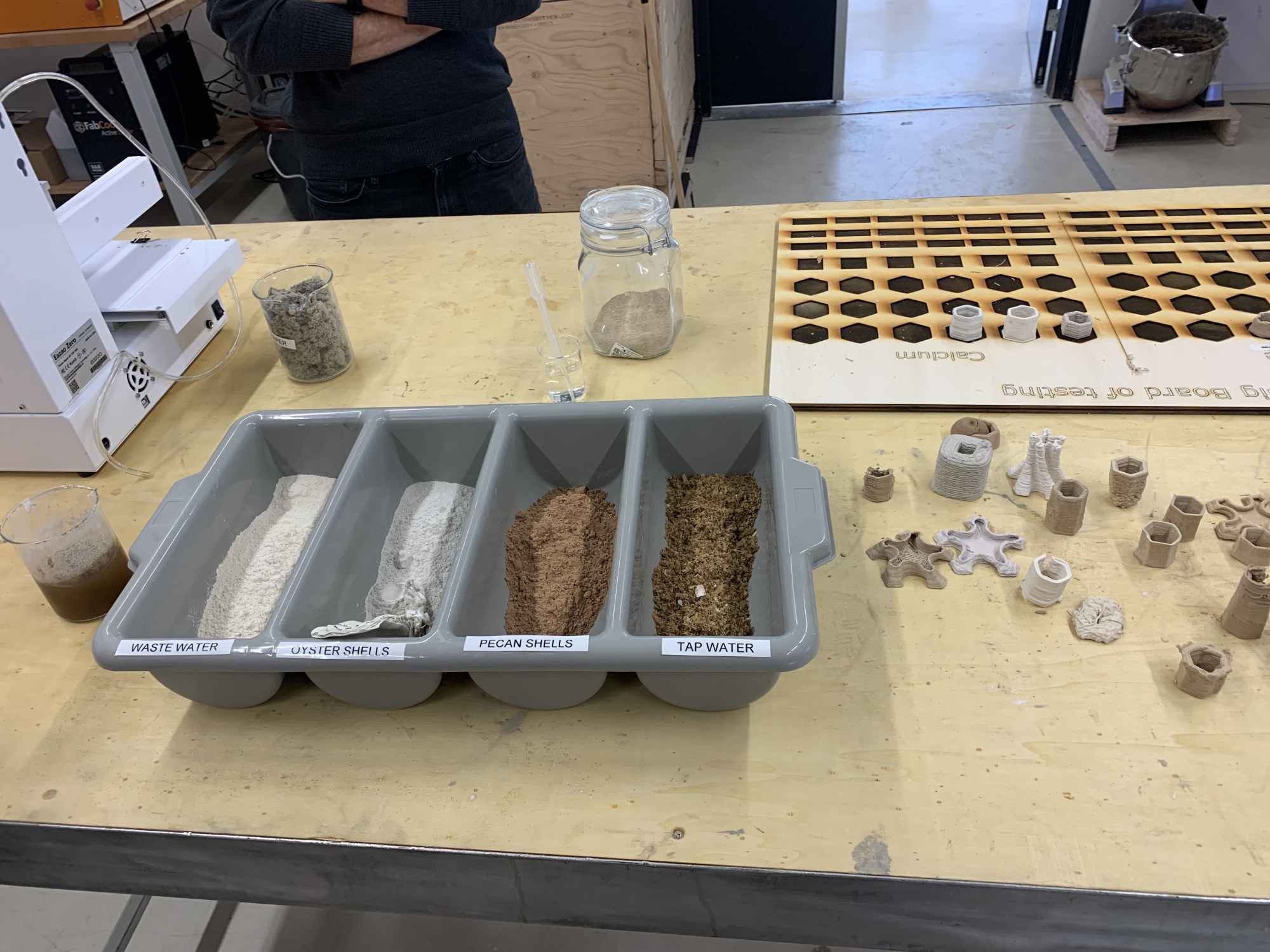 在这里,阿姆斯特丹高级都市解决方案研究所的创客空间里,人们一直在尝试利用有机废弃物材料创造环保产品。工程师们使用水和粘合剂的混合物,结合细碎的橄榄核、山核桃和牡蛎壳制成的粉末,甚至是从污水系统收集的加工过的厕纸。