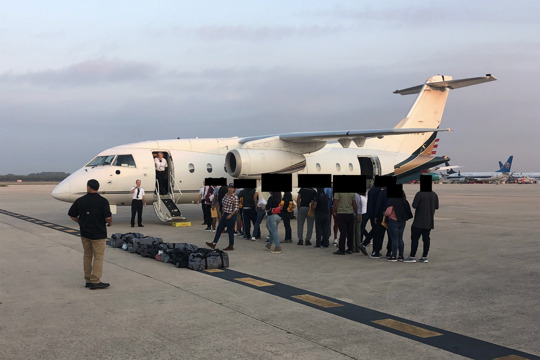 移民们登上了从圣安东尼奥飞往玛莎葡萄园的包机航班。来源:佛罗里达州州长办公室