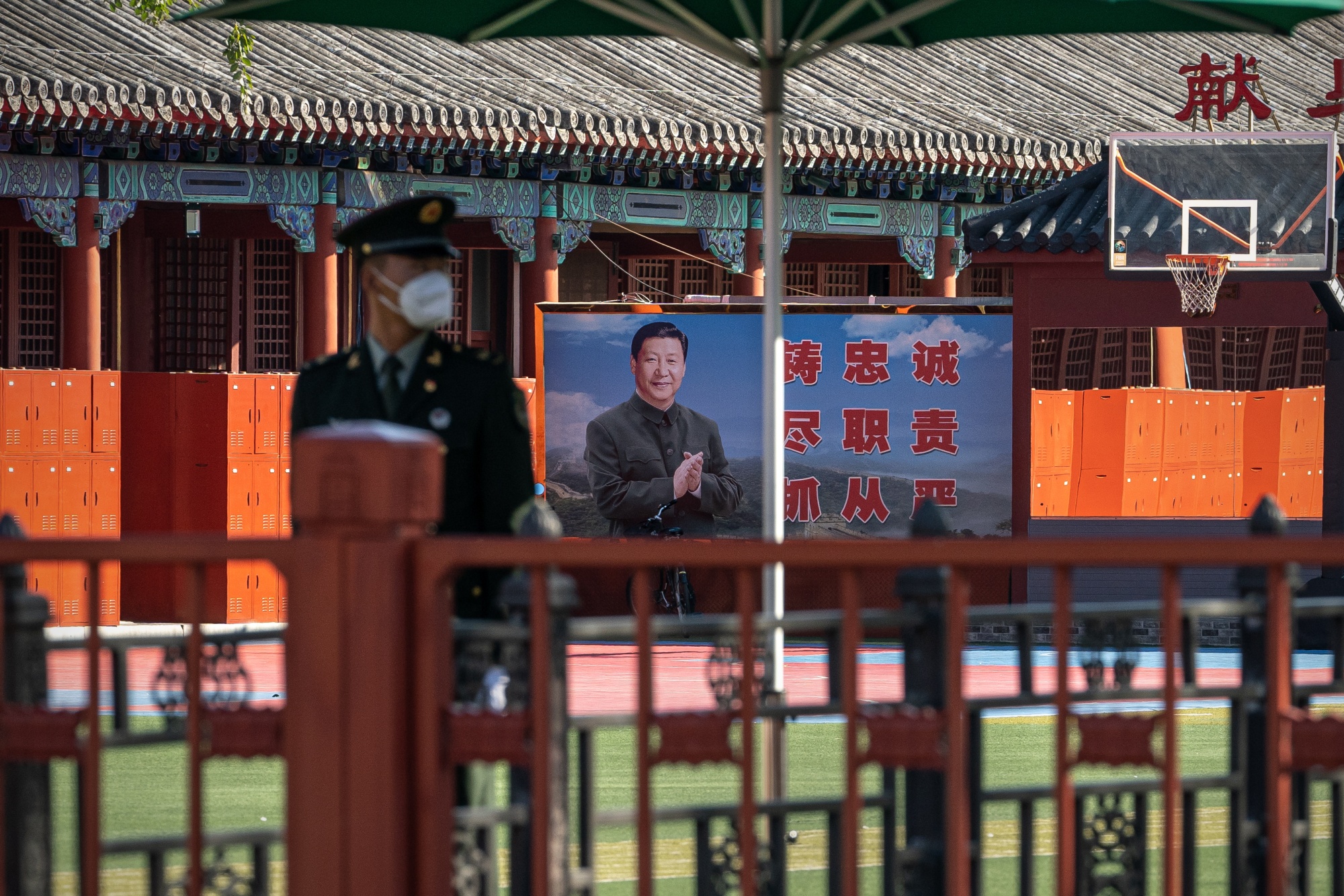 一名中国解放军士兵在北京的解放军营房前站岗,广告牌上展示着中国国家主席习近平的照片,2022年10月11日星期二。Bloomberg在讲话中,习近平捍卫了中国严格封锁、大规模检测和旅行限制的严厉政策,称这些政策挽救了生命,并避免承认这种做法的社会和经济成本 — 即使作为全球第二大经济体,中国现在的增长速度将是四十多年来第二慢的。