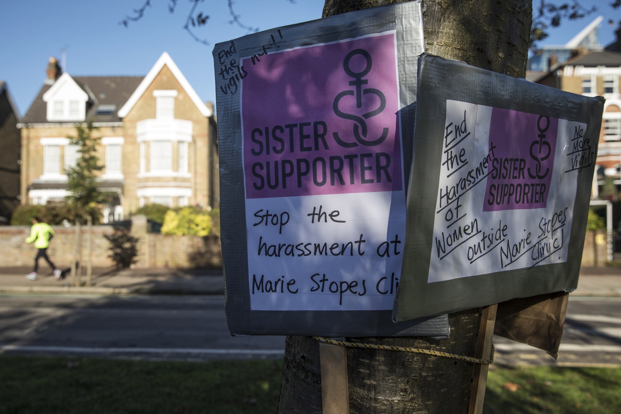 支持公共空间保护令的标语出现在伦敦玛丽·斯托普斯堕胎诊所外。