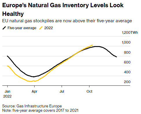 储备燃料的努力意味着欧洲和亚洲正以健康的库存迎接冬季,因为各国政府试图对抗俄罗斯供应的萎缩。欧洲的天然气储存点大约有92%的容量被使用,而德国已经达到了95%,这是它计划在11月1日前达到的水平。亚洲的情况也类似。