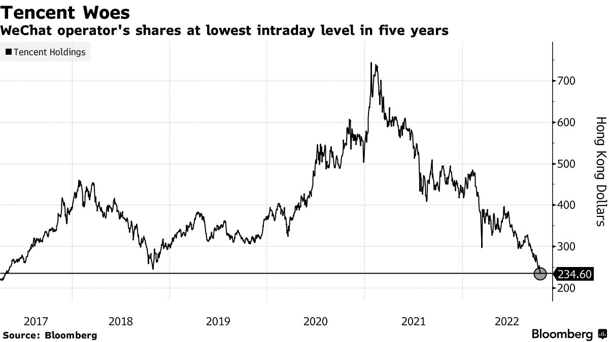 腾讯控股有限公司 正在以五年来的最低点收盘,投资者情绪转为负面,担忧中国宏观前景。