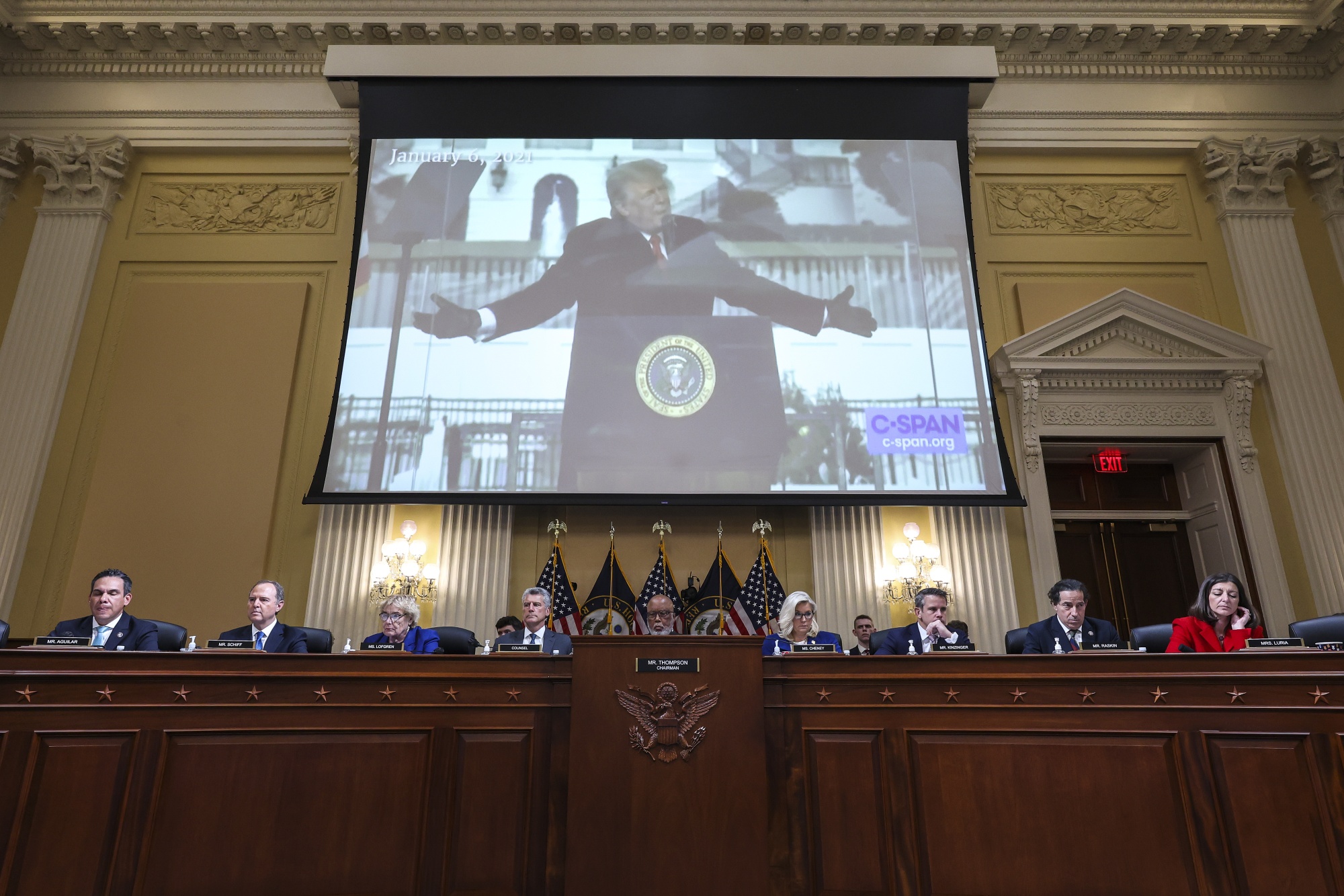 前总统唐纳德·特朗普的视频在华盛顿特区国会山1月6日袭击调查特别委员会听证会期间显示在屏幕上,日期为10月13日。