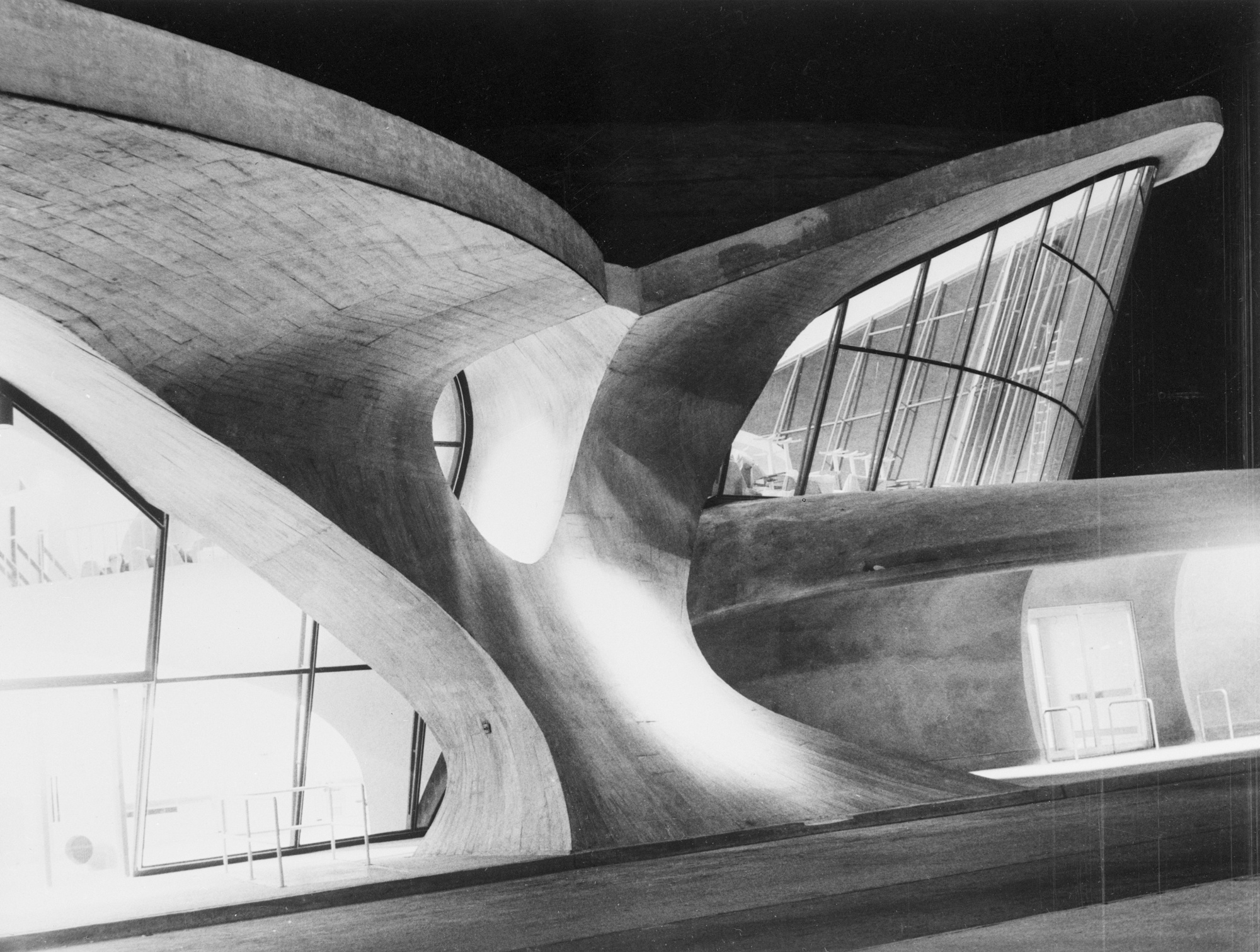 肯尼迪国际机场的TWA。在Eero和Aline相遇之前,麻省理工学院的克雷奇礼堂正在建设中,所有的新闻报道基本上只是陈述关于建筑的事实。没有叙事,没有故事。我追溯了TWA被描述的方式,以及一直使用的鸟儿展翅飞翔的比喻。如果你看新闻报道,有很多将其与鸟骨骼、翱翔的鸟进行比较。但Eero并不喜欢鸟的比喻。这是喷气式飞行的黄金时代,他对用户体验很感兴趣。内部空间在宏伟的洞穴空间和墙壁的曲线之间产生张力,让你感觉自己处于一个较小的空间中。然后你走进一个狭窄的通道到达登机口,然后在空中飞行,你被封闭但自由。