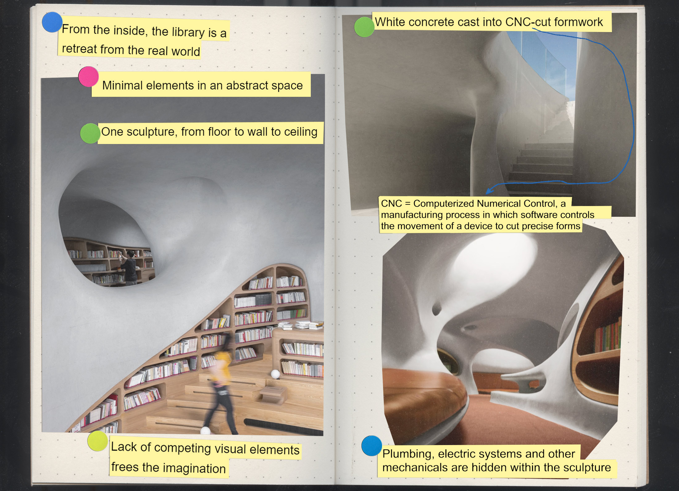 照片:MAD建筑事务所提供。插图:Stephanie Davidson但“虫洞图书馆”的设计并非从电脑上开始。马先生表示,建筑师们首先为图书馆建立了一个物理模型,然后再想办法用软件对其进行建模。MAD使用这些参数化工具来设计浇筑建筑物混凝土的模具(称为模板)。然后建筑师们转向计算机数控(CNC)激光切割机,精确制造模具。每一个曲线都必须精确无误,才能使建筑物完美结合,因为任何错误的测量或浇筑中的缺陷都会在混凝土中显现出来。渐近测量,一次切割 —— 这可能是“虫洞图书馆”的MAD口号。