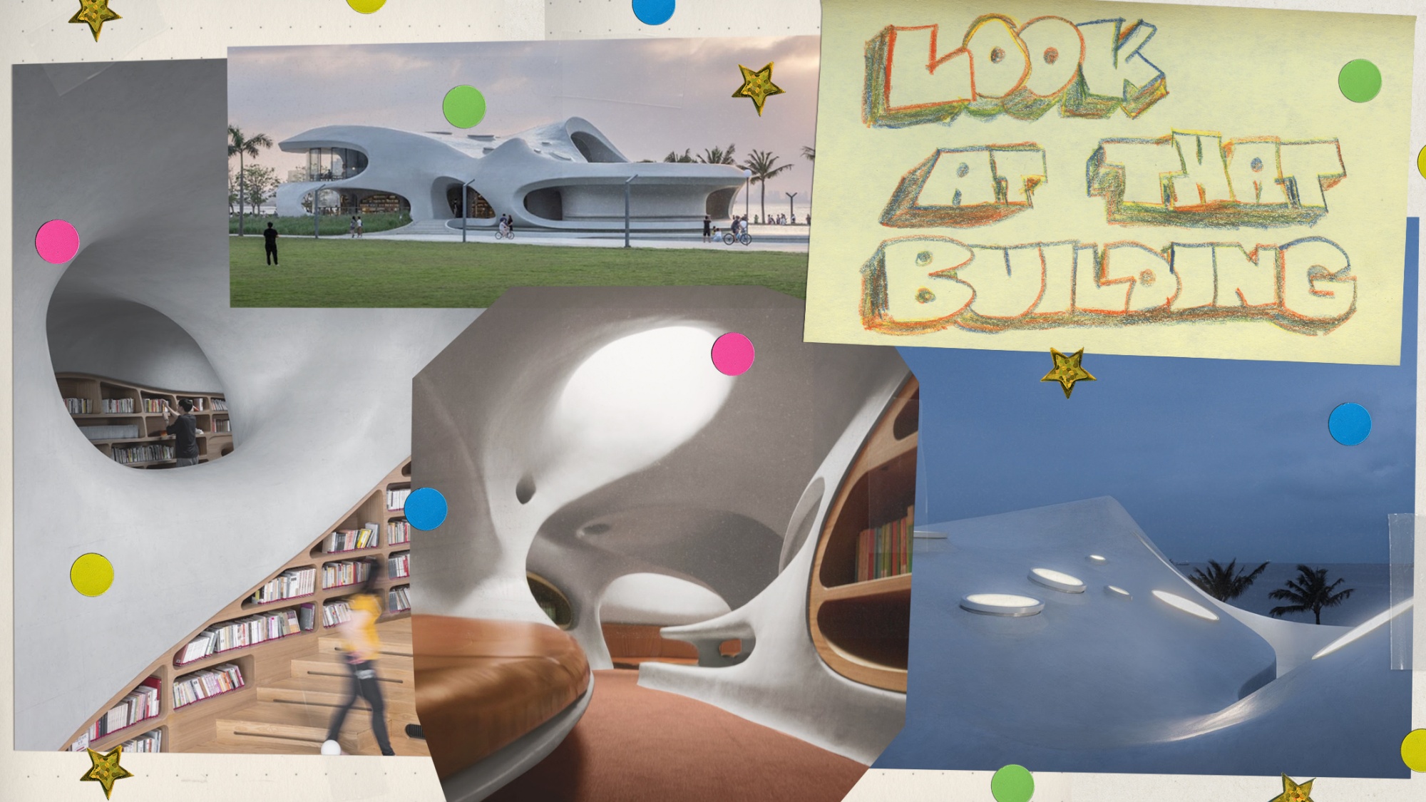 照片:MAD建筑事务所提供。插图:Stephanie Davidson建筑物低矮的框架赋予其舒适而未来感:想象一下霍比特人洞穴,但在太空中。(值得一提的是,MAD还设计了正在洛杉矶建设中的同样具有科幻设计的卢卡斯博物馆。这一主题延续到室内,弯曲的墙壁和窗户营造出明亮的房间和昏暗的角落,为不同的阅读体验创造了空间。